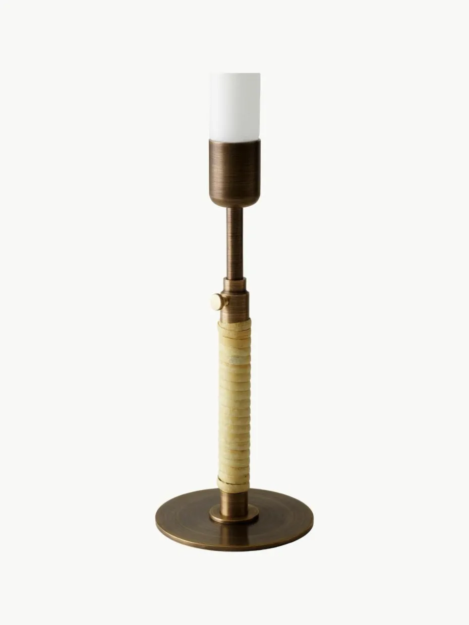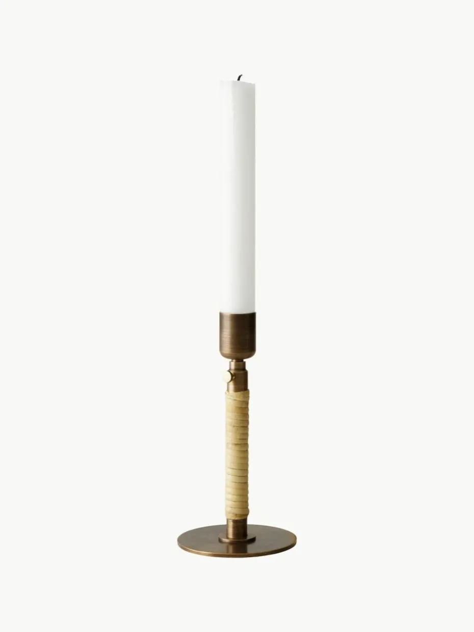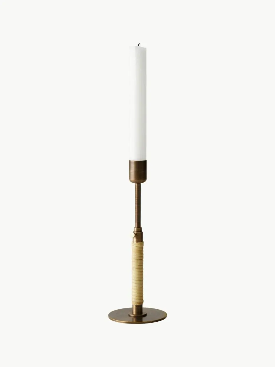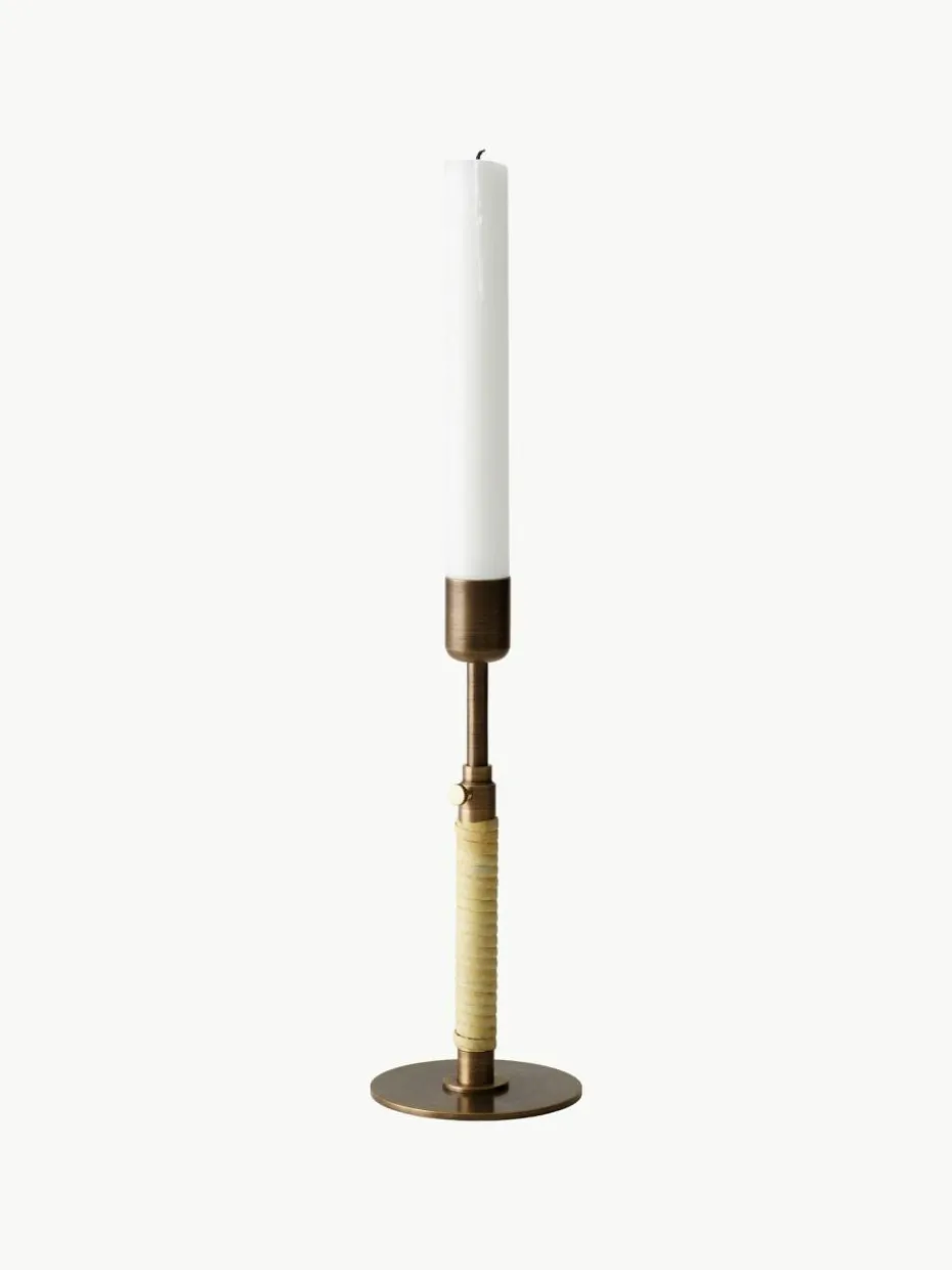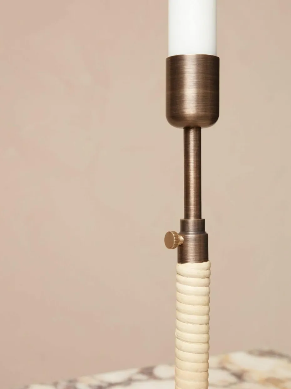 Der DUCA Kerzenhalter, dessen Name vom lateinischen Wort für „verlängern“ abgeleitet ist, tut genau das: Durch Lösen der Schraube an seinem schlanken Stiel kann die Höhe des Designs während des Abbrennens der Kerze angepasst werden. Das schlichte, aber wirkungsvolle Design aus poliertem oder bronziertem Messing mit Rattangeflecht um die untere Hälfte bringt ein Gefühl von Intimität und Wärme in die Umgebung. Der Kerzenhalter DUCA ist mit Rattan um den Stiel herum verziert. Eine kleine Schraube an der Seite des Designs ermöglicht es dem Benutzer, die Höhe einzustellen und den Teleskopstab je nach gewünschtem Effekt zu verlängern oder zu verkürzen.