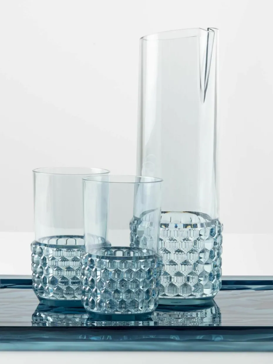 JELLIES von Designerin Patricia Urquiola ist eine vielseitige Serie von Tellern, Tabletts, Gläsern, Schüsseln, Karaffen, Kaffeetassen und Zuckerdosen. Die Besonderheit der Serie ergibt sich aus der Tatsache, dass jedes Modell ein anderes Muster hat. Organische Formen lehnen sich an Aspikformen von früher an. Die Zusammenstellung von Tellern verschiedener Formen und Farben sorgt für ein einfallsreiches, aber gleichzeitig unaufdringliches, kreatives und edles Gesamtbild.