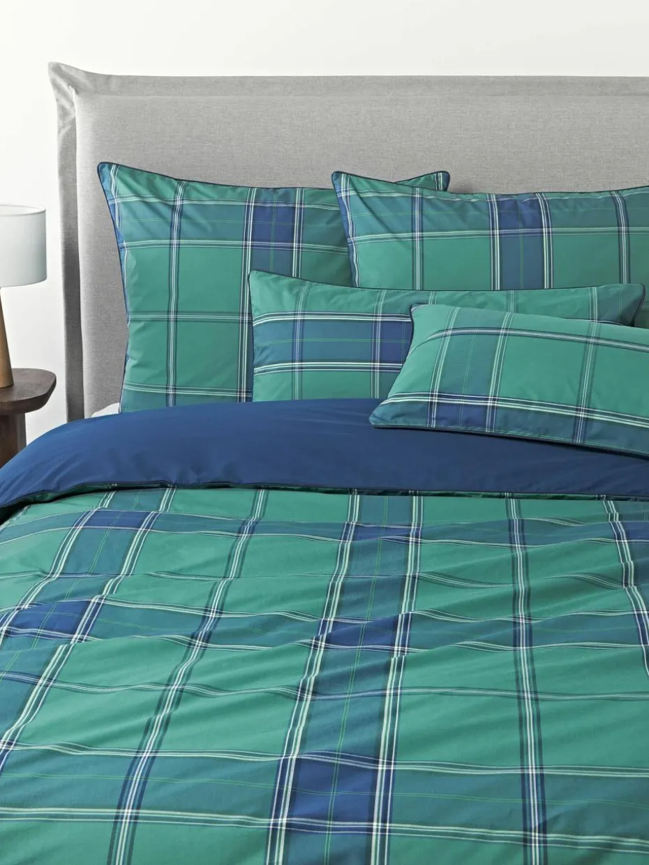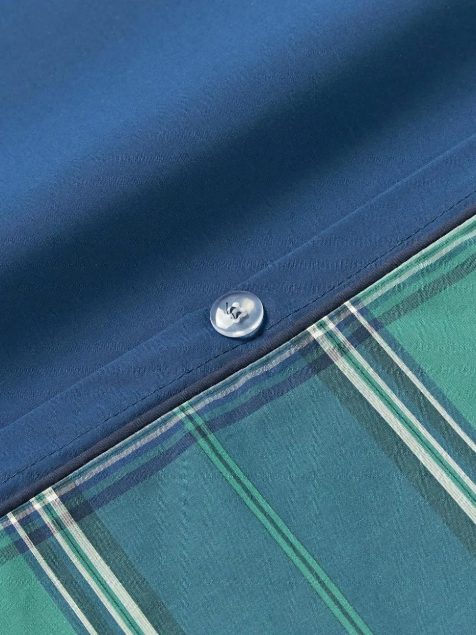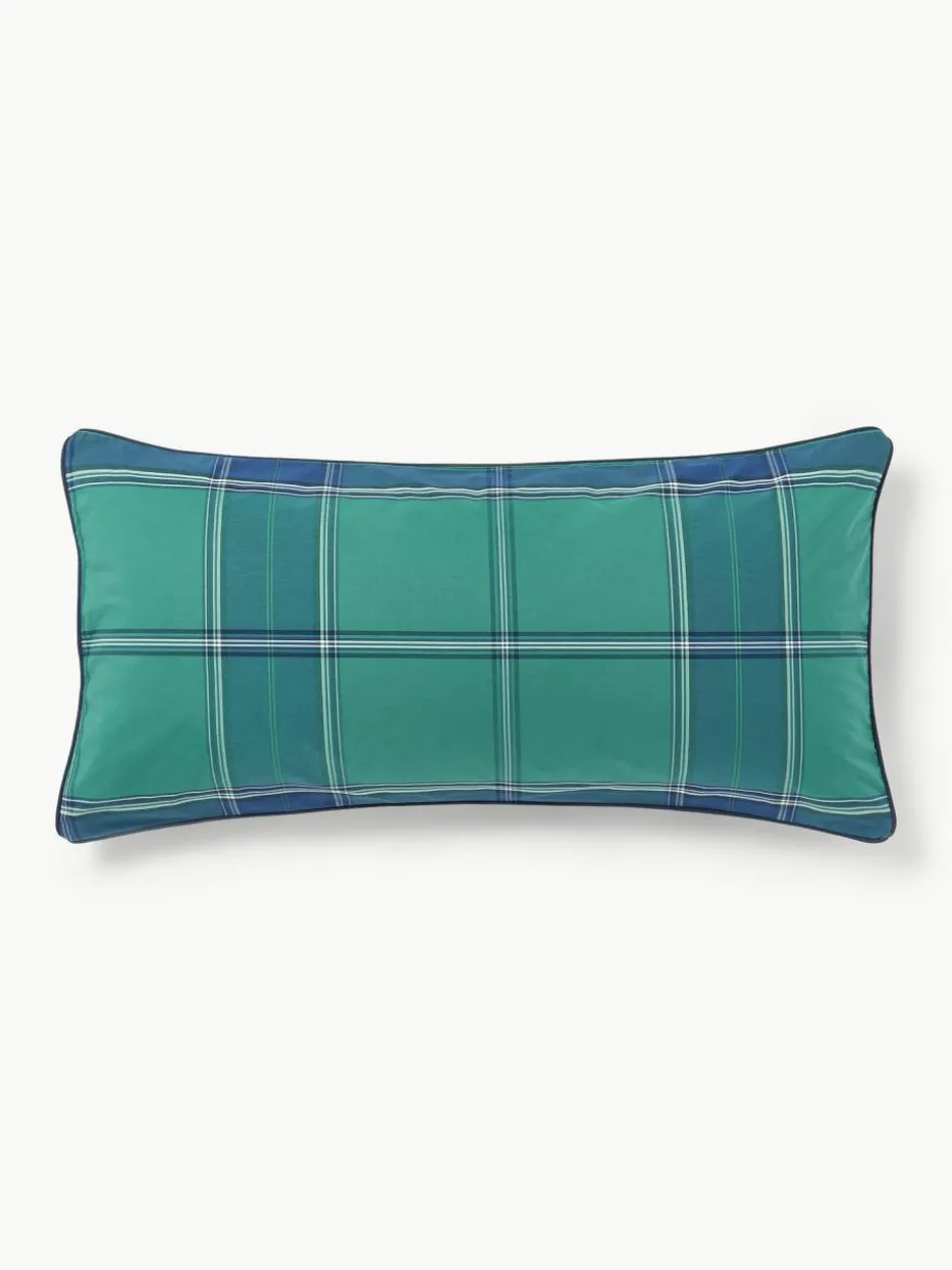 Der Baumwollperkal-Kopfkissenbezug mit karierter Vorderseite und unifarbener Rückseite verfügt über einen Knopfverschluss und wurde in Portugal gefertigt.