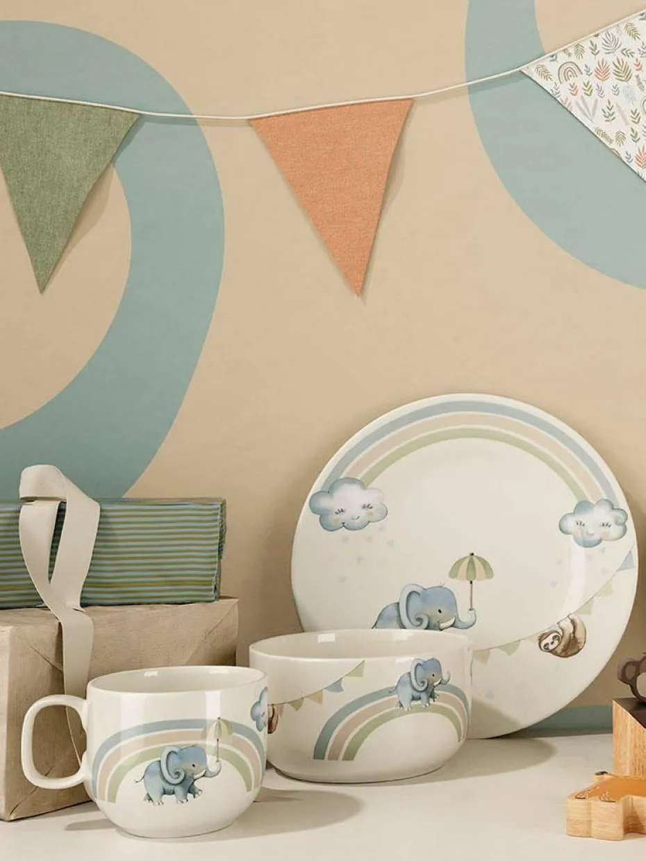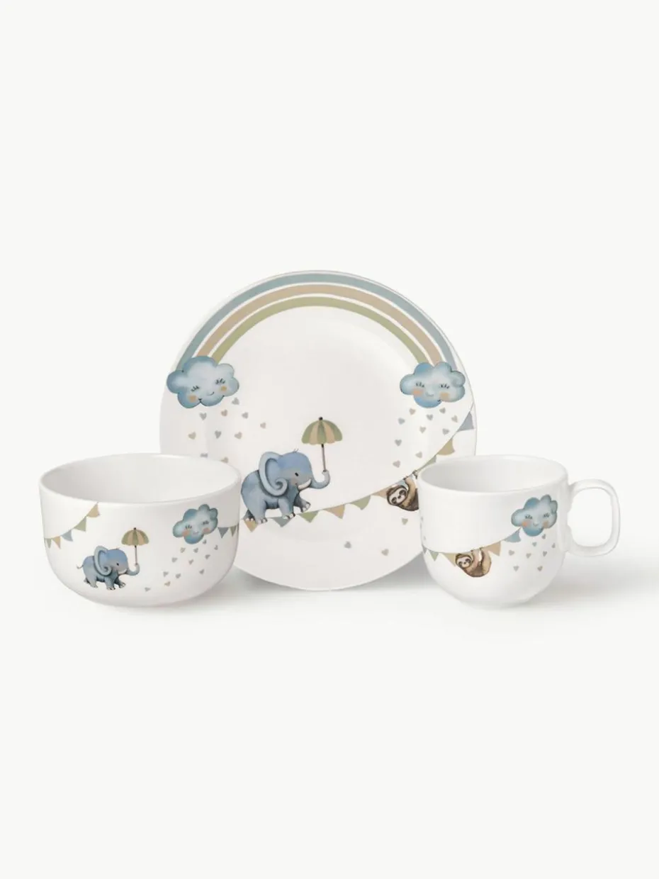 Dieses 3-teilige Kindergeschirr-Set besteht aus einem Frühstücksteller, einem Schälchen und einer Tasse.