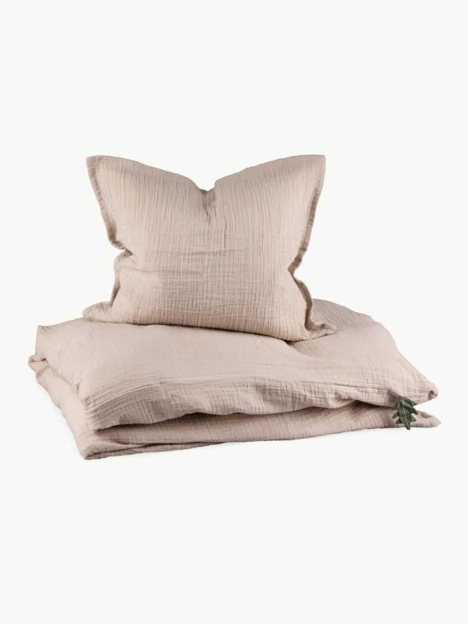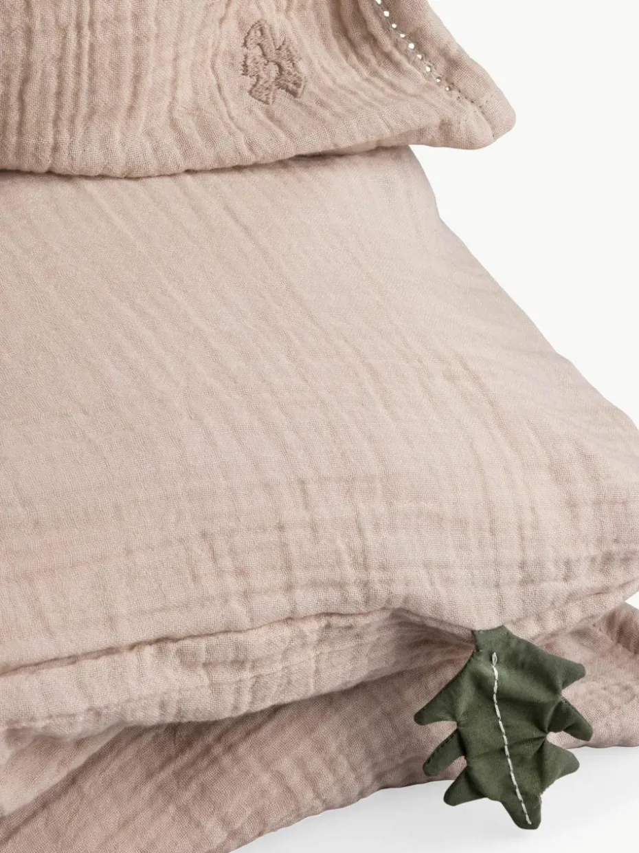 Diese kuschlig weiche Bettwäsche aus hochwertigem, zwei-lagigem Musselin überzeugt mit wunderschöner Lochstickerei und ist außerdem mit einer kleinen aufgenähte Lasche in Blattform versehen, die Dein Kind beim Einschlafen ertasten kann.