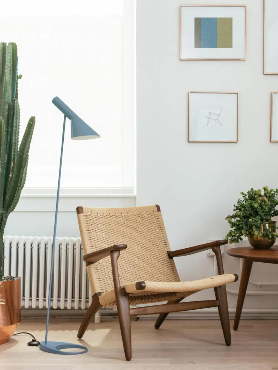 Die AJ Leuchte wurde 1957 für das SAS Royal Hotel in Kopenhagen entworfen und ist ein legendäres Design von Arne Jacobsen. Das Design ist grafisch und stilrein in seinem Ausdruck, was ihm einen zeitlosen Look verleiht. Die AJ Stehleuchte sorgt für ein nach unten gerichtetes Licht. Die Neigung des Schirms kann individuell angepasst werden. Der Schirm ist auf der Innenseite weiß lackiert, wodurch ein gleichmäßiges, weiches Licht erzeugt wird.