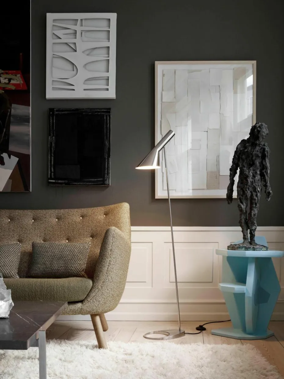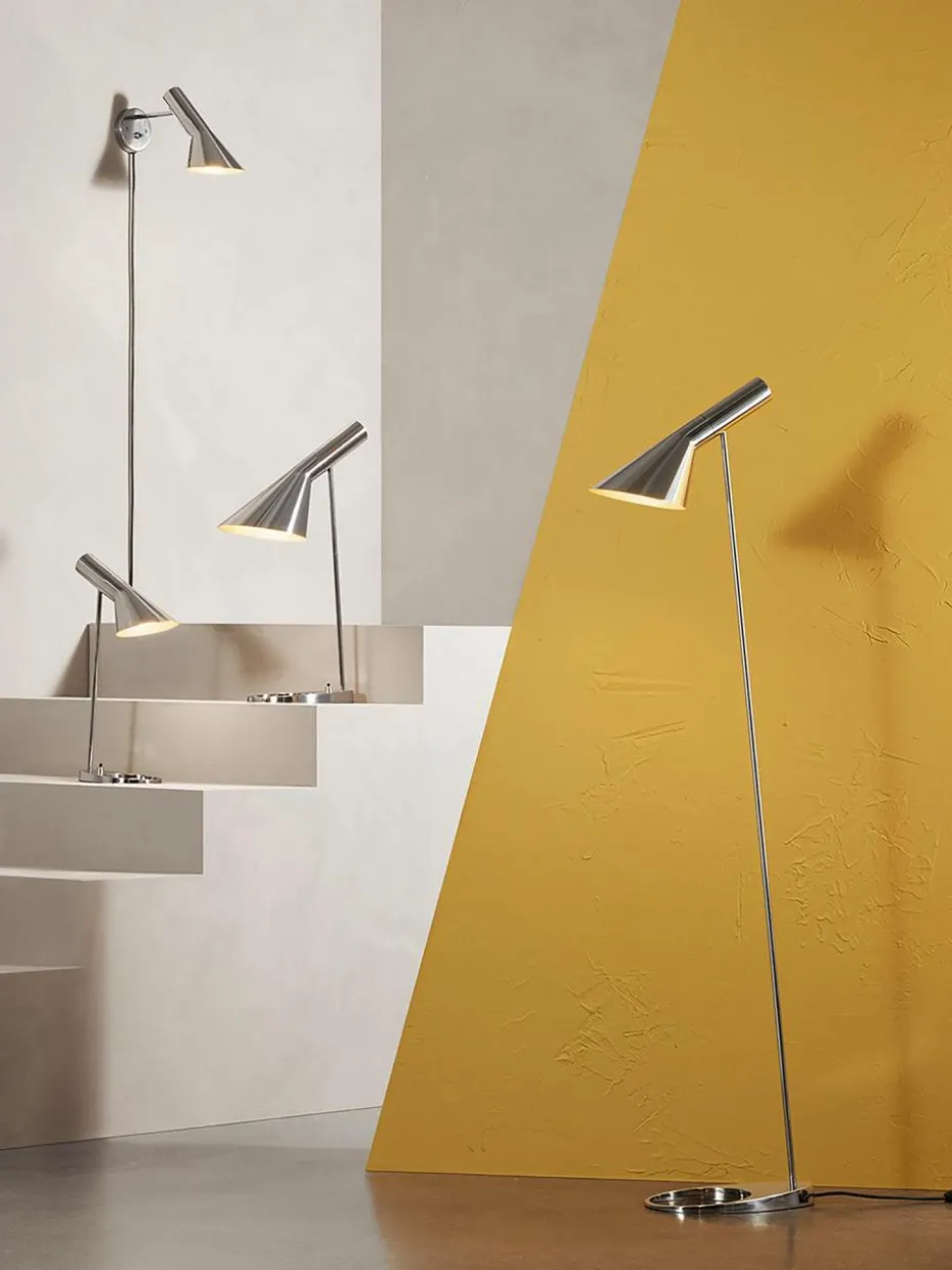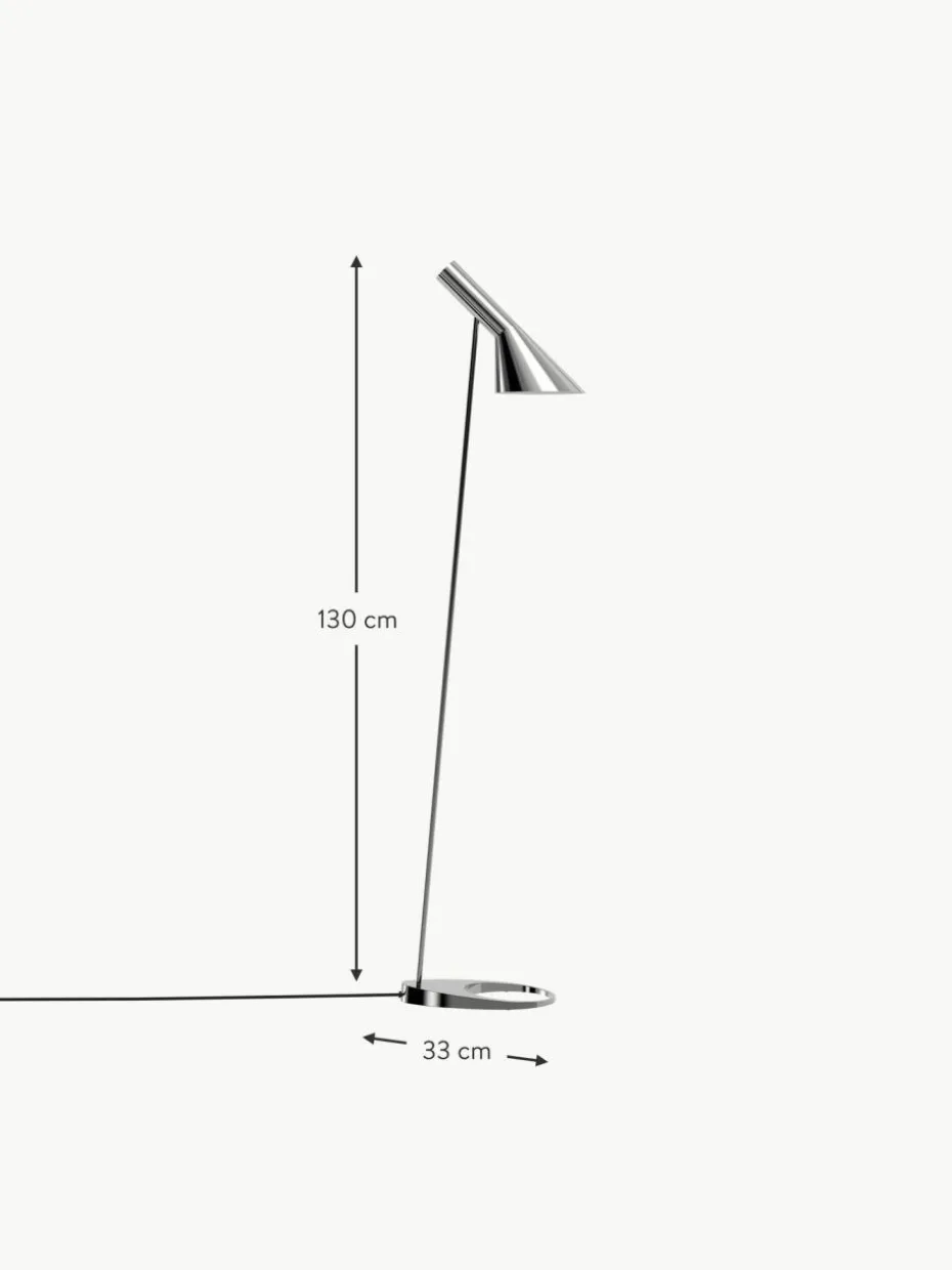 Die AJ Leuchte wurde 1957 für das SAS Royal Hotel in Kopenhagen entworfen und ist ein legendäres Design von Arne Jacobsen. Das grafische und stilreine Design verleiht der Lampe einen zeitlosen Look. Die AJ Stehleuchte sorgt für ein nach unten gerichtetes Licht, wobei die Neigung des Lampenschirms individuell angepasst werden kann. Durch die weiße Lackierung auf der Innenseite des Schirms wird ein gleichmäßiges, weiches Licht erzeugt.