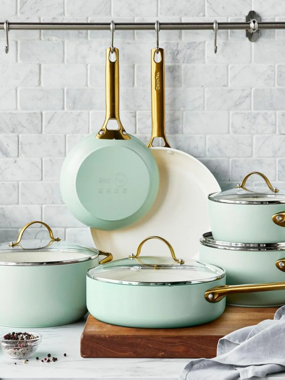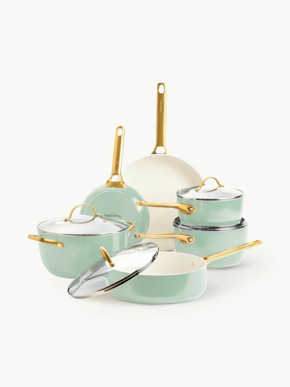 Das zehnteilige Kochtopf-Set besteht aus zwei Kochtöpfen mit Deckeln, einem Suppentopf mit Deckel, zwei Bratpfannen und einer Schmorpfanne mit Deckel.