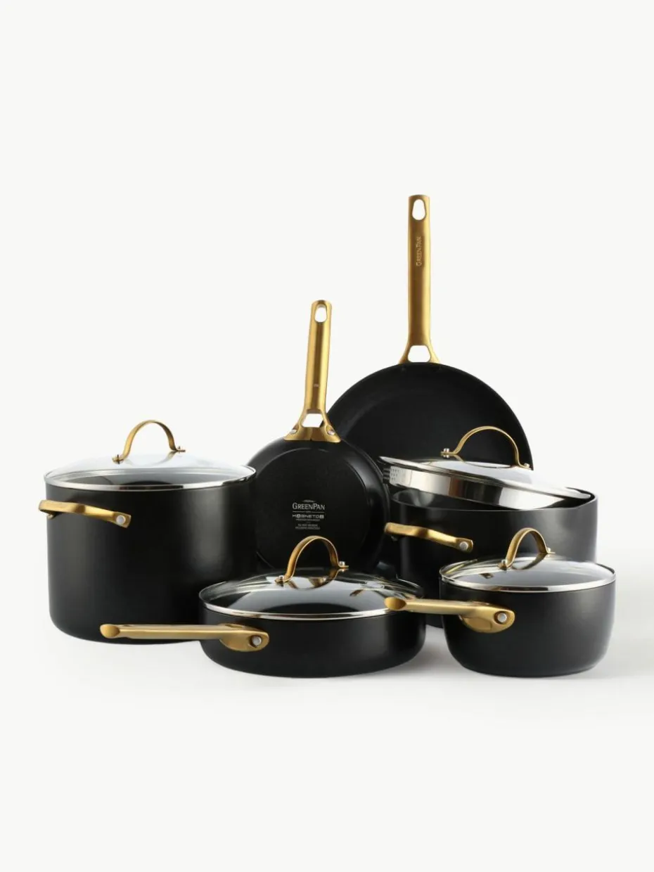 Das zehnteilige Kochtopf-Set besteht aus zwei Kochtöpfen mit Deckeln, einem Suppentopf mit Deckel, zwei Bratpfannen und einer Schmorpfanne mit Deckel.