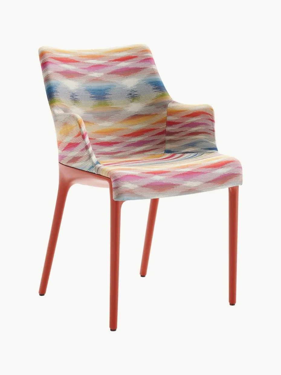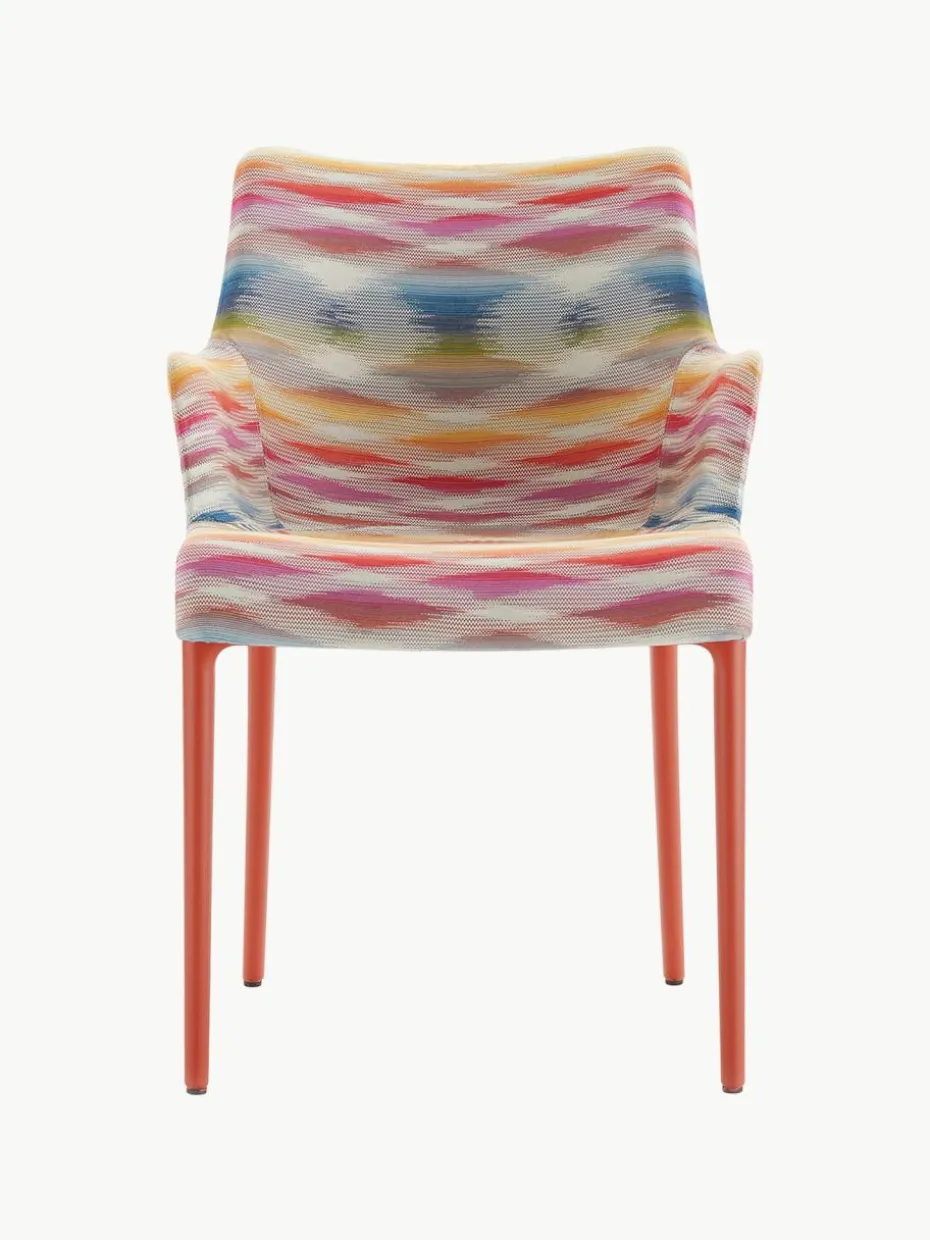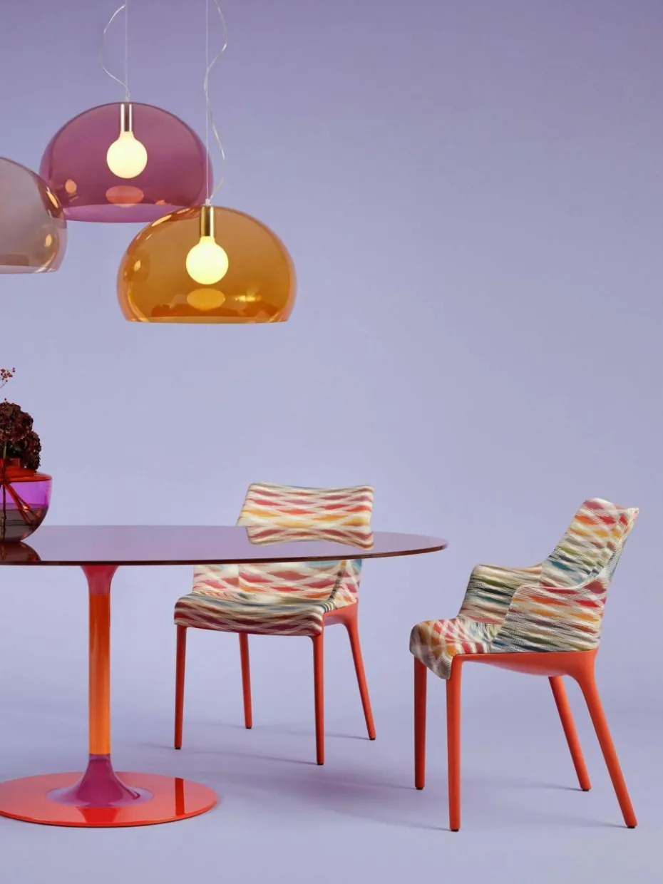 Hier kommt die finale Version der ELEGANZA MISSONI, Philippe Starcks Stühle für Kartell in Zusammenarbeit mit der Modemarke. Die Jacquardstoffe behalten die starken geometrischen Muster, die für die Marke charakteristisch sind, jedoch mit einer speziellen Anpassung für den Einsatz in der Einrichtung. Ein stilvolles und raffiniertes Outfit für einen Stuhl mit technologischem und umweltfreundlichem Charakter: Die Struktur besteht aus dem Recycling-System für illycaffè-Kapseln, das im vergangenen Jahr vorgestellt wurde.