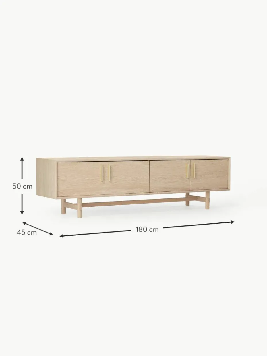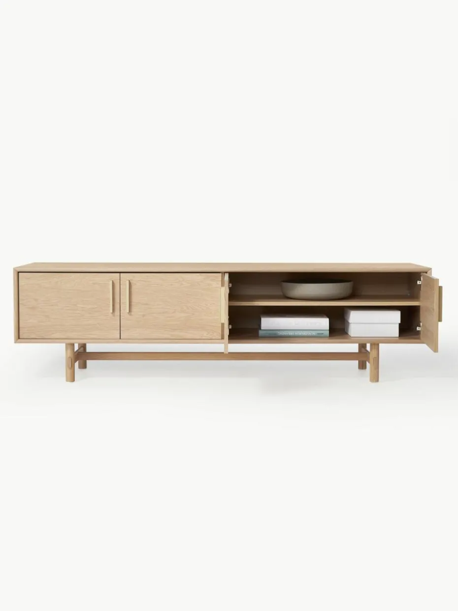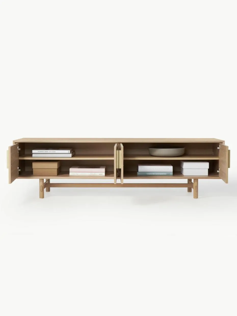 Das Lowboard verfügt über vier Türen und vier Fächer.