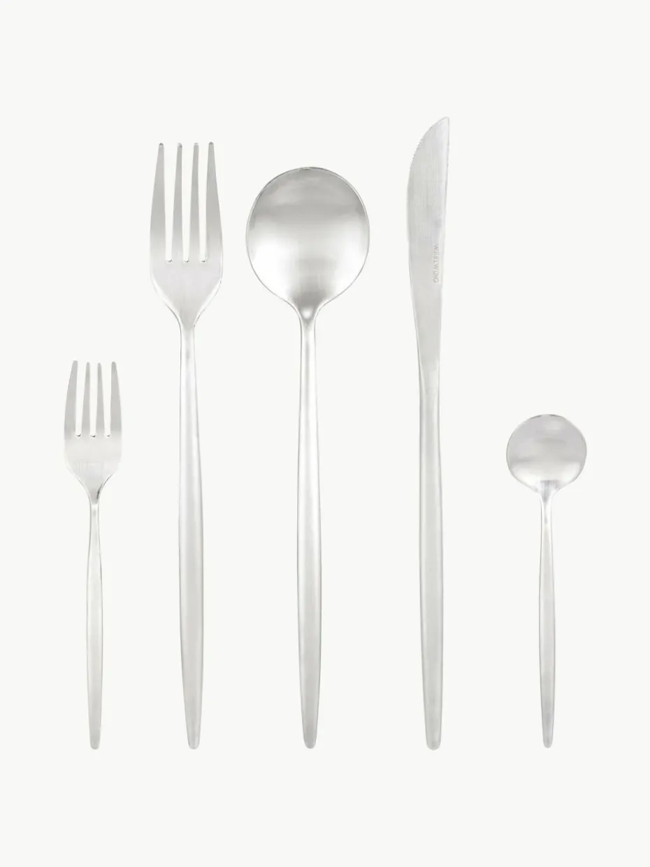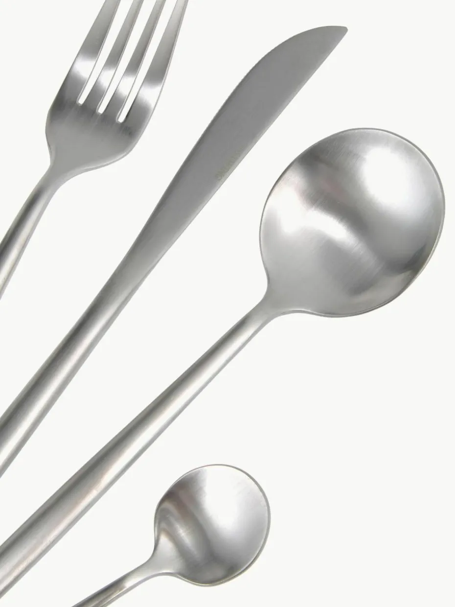 Dieses 20-teilige Besteck-Set mit gebürsteter Oberfläche besteht aus vier Tafelgabeln, vier Tafelmessern, vier Tafellöffeln, vier Kuchengabeln und vier Teelöffeln.“,“pdp_care_label“:“Spülmaschinenfest