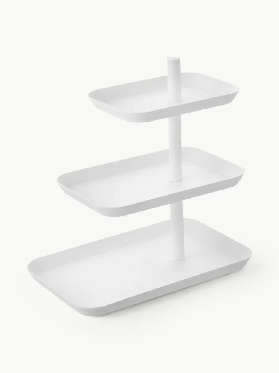 Diese Etagere bietet drei Ebenen zur Präsentation und Aufbewahrung, die mit einem dezenten Holzakzent versehen sind. Jedes Tablett ist vollständig drehbar, was den Zugang und die Anordnung erleichtert. Er ist ideal für die Aufbewahrung von Zubehör und kann auch als Dessertständer verwendet werden.“,“pdp_care_label“:“Von Hand spülen