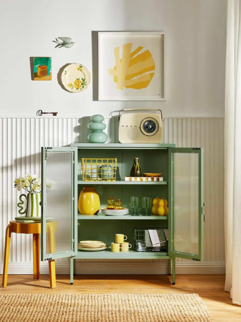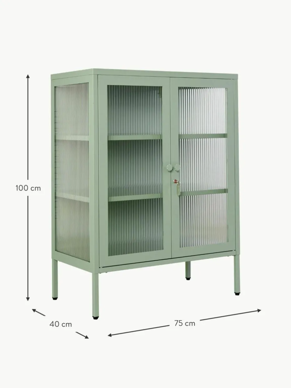 Wenn Deine Lieblingsstücke zu schön sind, um sie zu verstecken, ist die THE MIXER Serie da, um sie stilvoll zur Schau zu stellen. Die Metall-Vitrine dient perfekt als Drinks-Schrank und verfügt über geriffeltes Glas, das ein bisschen Raum für Fantasie lässt. Medaillon-Griffe, ein maßgefertigter Emaille-Schlüsselanhänger und verstellbare Füße machen es zur idealen Kombination aus Schönheit und Funktionalität.