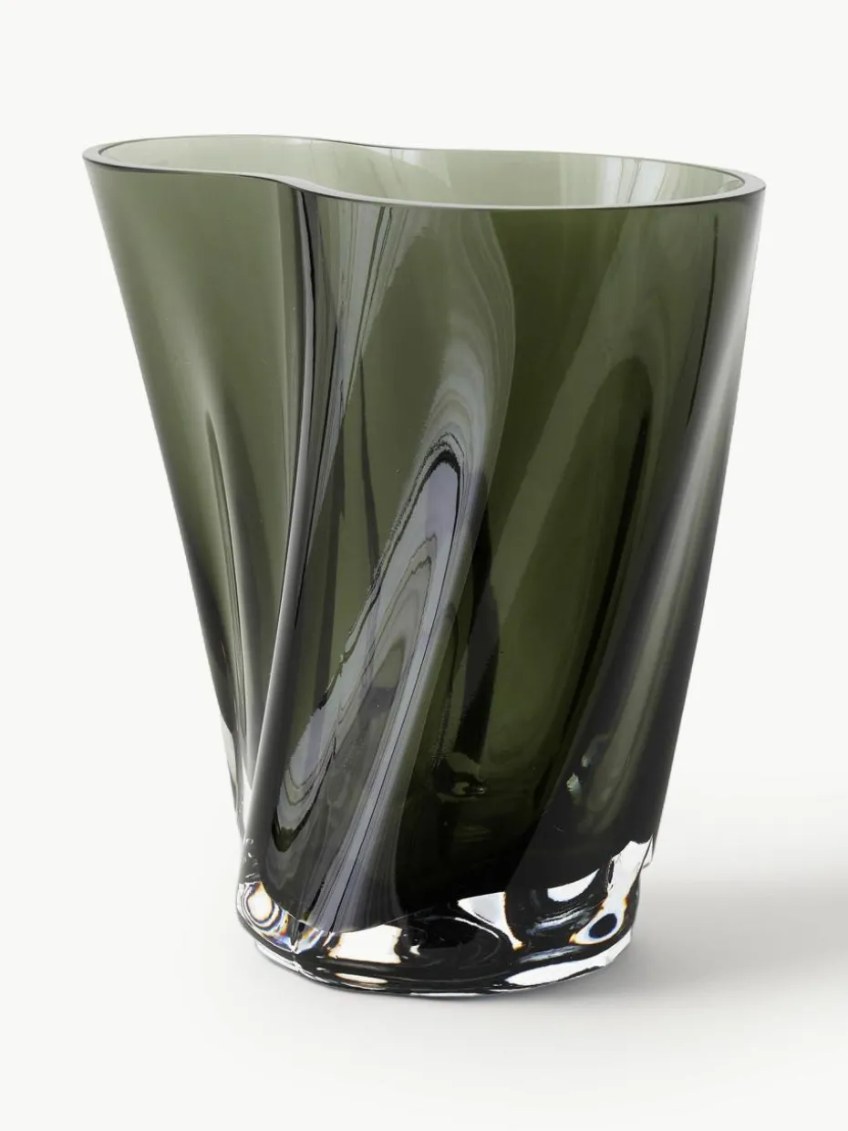 Gabriel Tans Wertschätzung für Einfachheit, skulpturale Schönheit und Funktionalität kommt in der AER Collection zusammen. Die gewellte, asymmetrische Silhouette der AER Vase ist perfekt, um sie aus der Ferne zu bewundern und aus der Nähe zu erkunden. Mit ihren flüssigkeitsähnlichen Wellen wurde sie so gestaltet, dass sie an die spiralförmige Bewegung der Luft erinnert, die man durch Rauch oder Nebel sieht. Das rauchfarbene Glas, das sich sanft zum Boden hin verjüngt, hat eine taktile, fast ätherische Qualität, die einen Blumenstrauß sanft umarmt oder einem Raum als Einzelobjekt einen skulpturalen Reiz verleiht. Jede mundgeblasene Vase weist unterschiedliche optische Merkmale auf, die ihre Einzigartigkeit widerspiegeln.