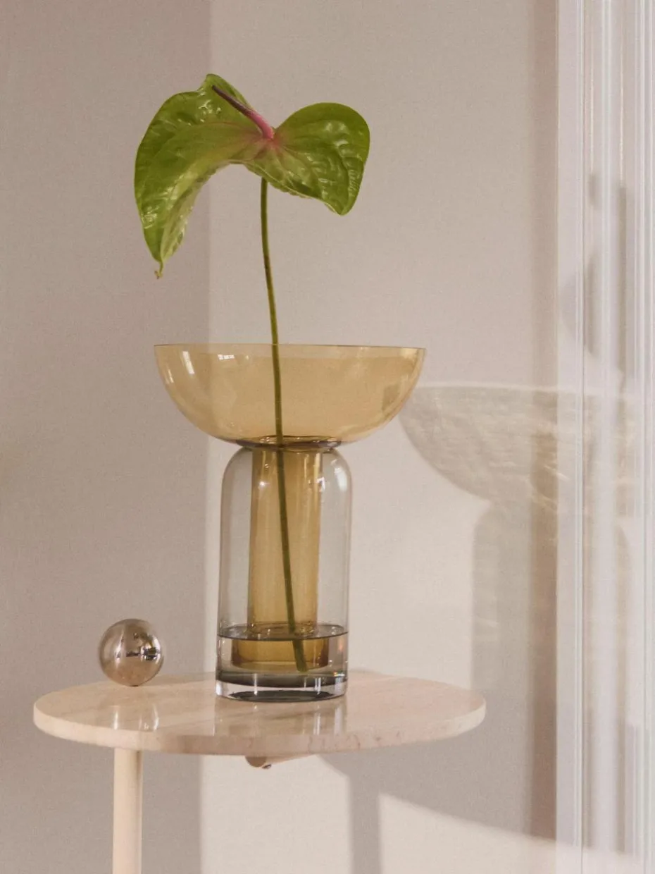 Die Vase Torus ist mit ihrem exklusiven Look ein einzigartiges Statement in jedem Zuhause – perfekt für Blumendekorationen, Zweige und Pflanzen. Die Kombination der beiden bunten Glasstücke ergibt eine elegante und skulpturale Vase, ideal für alle, die das gewisse Etwas suchen.