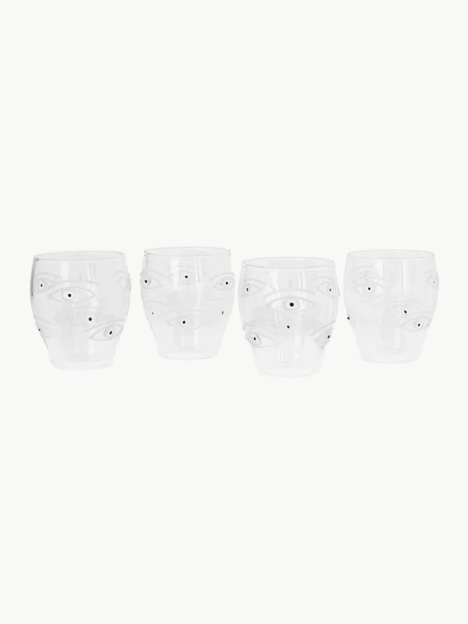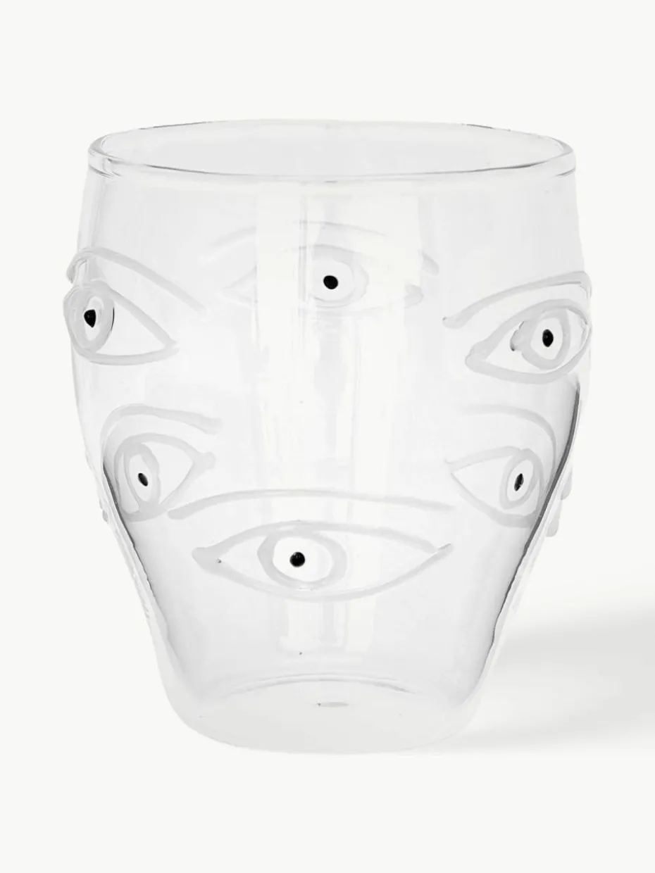Die handgefertigten Oculus Wassergläser sind mit einer Vielzahl von wunderschönen Blicken verziert. Die Augen werden während des Glasblasprozesses von erfahrenen Handwerkern angebracht, die die glühend heißen Glasfäden in verführerischen Augenmustern anbringen. Die surreale Überraschung, die Deine Hausbar braucht! „,“pdp_care_label“:“Von Hand spülen