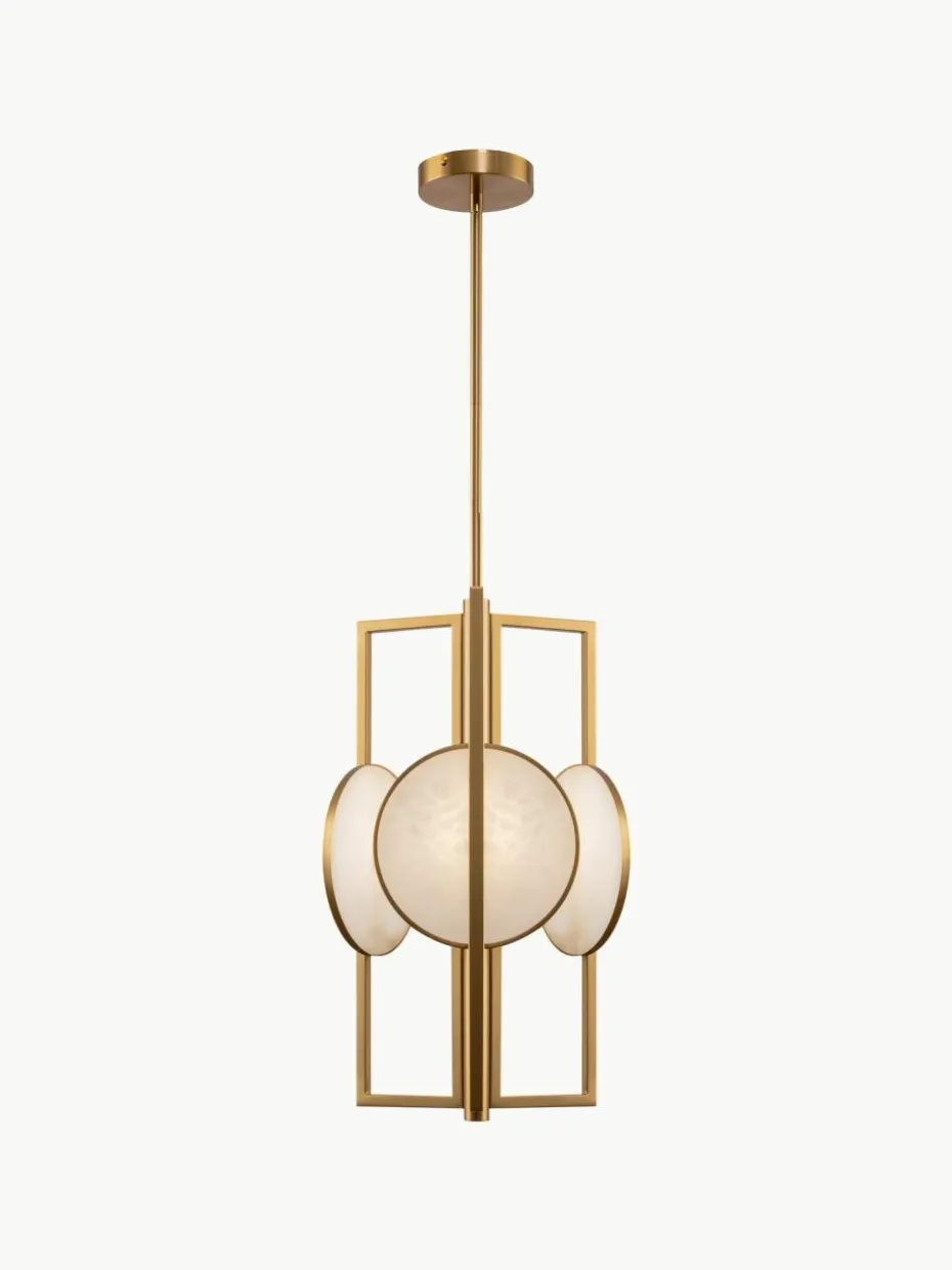 Die Pendelleuchte ist so elegant, dass Du mit ihrer Hilfe prächtige Kompositionen schaffen kannst, die den Raum mit einem Gefühl von Luxus und Raffinesse füllen. Die Metallstruktur leuchtet in einem hellen Goldton, wie eine Kerzenflamme. Seine galvanische Beschichtung verleiht jedem Interieur Eleganz und Luxus. Das wahre Meisterwerk dieser Lampen liegt jedoch im Detail – in den Natursteinfliesen. Sie sind einzigartig, als wären es von der Natur selbst geschnitzte Muster. Dieser Stein hat eine einzigartige Textur, seine Oberfläche verführt das Auge auf geheimnisvolle Weise und offenbart seine ganze natürliche Schönheit. Indem sie den Raum mit angenehmem Licht durchdringen, fungieren die Lampen nicht nur als funktionales Element, sondern wirken auch wie ein Kunstwerk. Die Kombination strenger rechteckiger Linien mit eleganten, runden Designelementen verbindet sich mit echtem ästhetischen Genuss. Lampen können selbst den minimalistischsten Innenräumen Harmonie verleihen und ihnen Lebendigkeit und Tiefe verleihen.