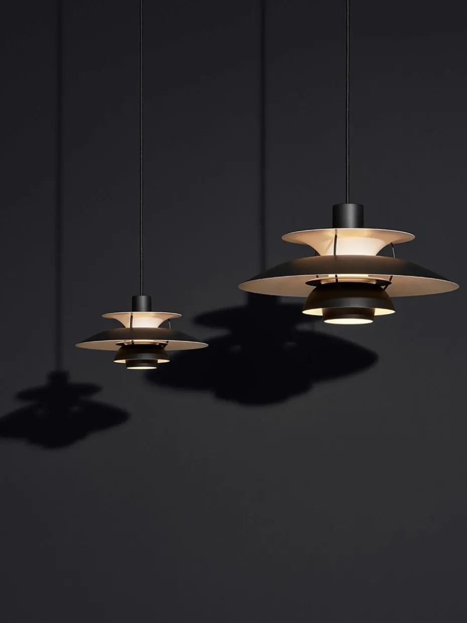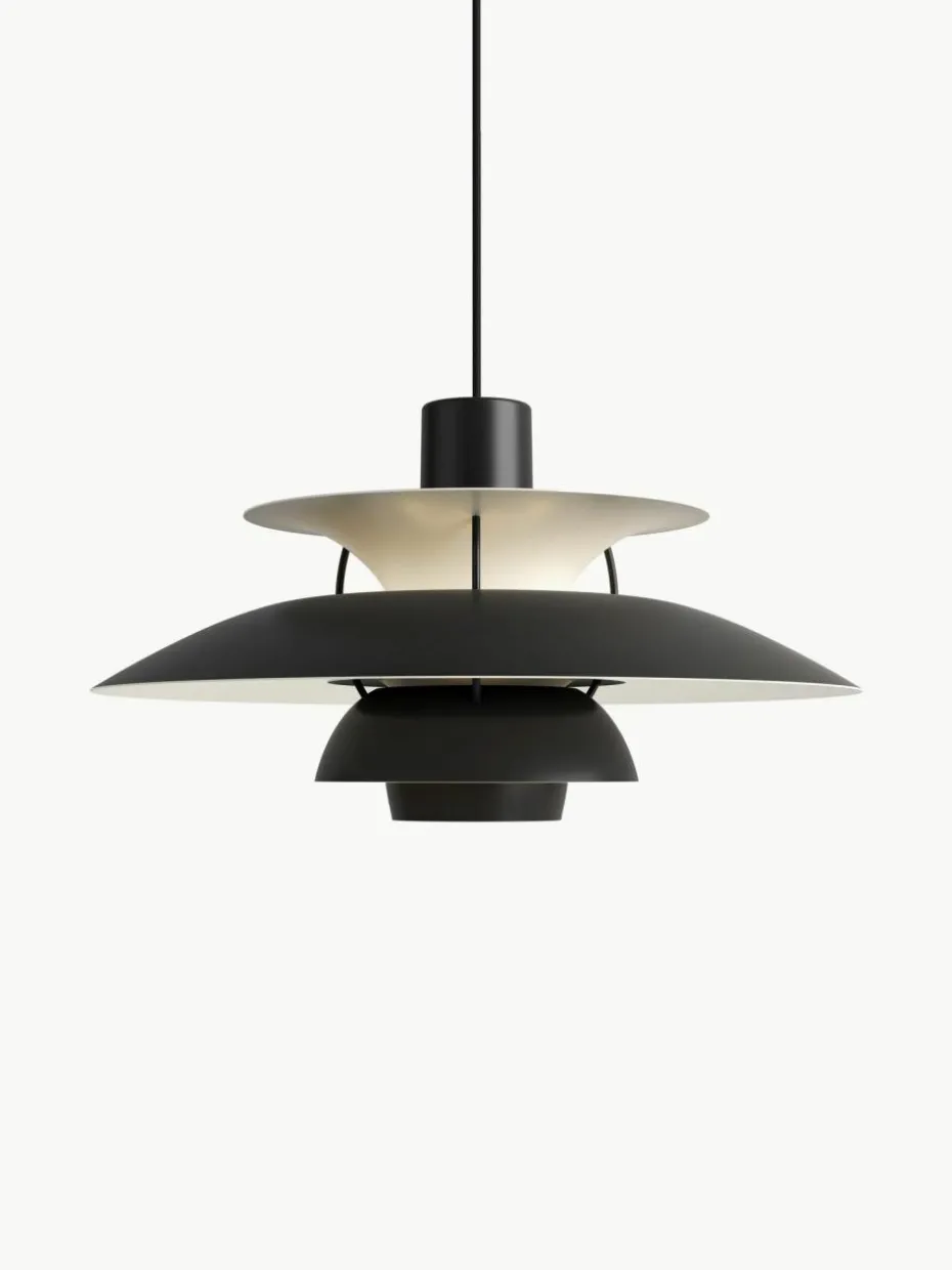 Die Pendelleuchte strahlt blendfreies, nach unten gerichtetes Licht ab. Gleichzeitig beleuchtet sie ihren eigenen Rahmen und erzeugt so aus ihrem Zentrum einen weichen, angenehmen Lichtschein. Entworfen wurde die PH 5 von Poul Henningsen im Jahr 1958 als Reaktion auf die vielen Änderungen in Form und Größe von Glühbirnen.