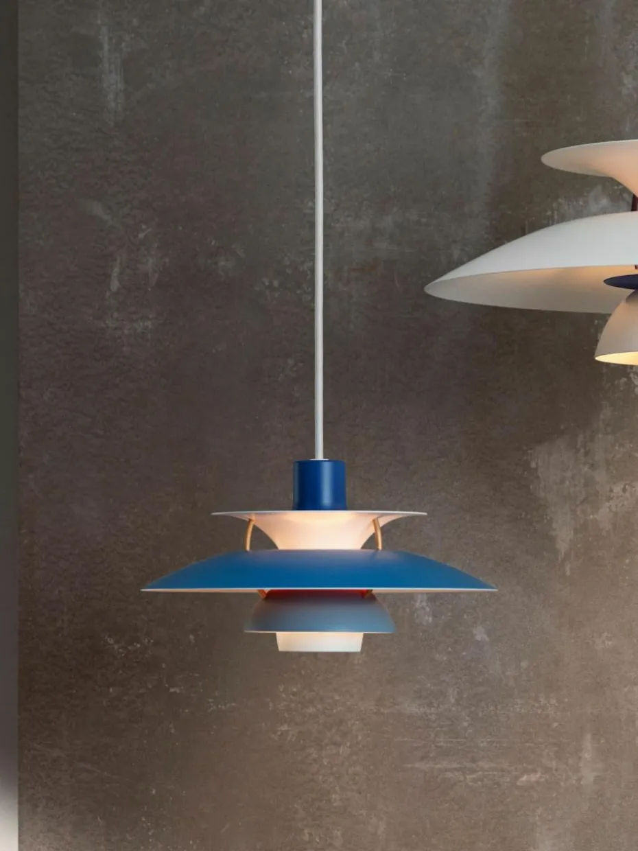 Die Pendelleuchte strahlt blendfreies, nach unten gerichtetes Licht ab. Gleichzeitig beleuchtet sie ihren eigenen Rahmen und erzeugt so aus ihrem Zentrum einen weichen, angenehmen Lichtschein. Entworfen wurde die PH 5 von Poul Henningsen im Jahr 1958 als Reaktion auf die vielen Änderungen in Form und Größe von Glühbirnen.