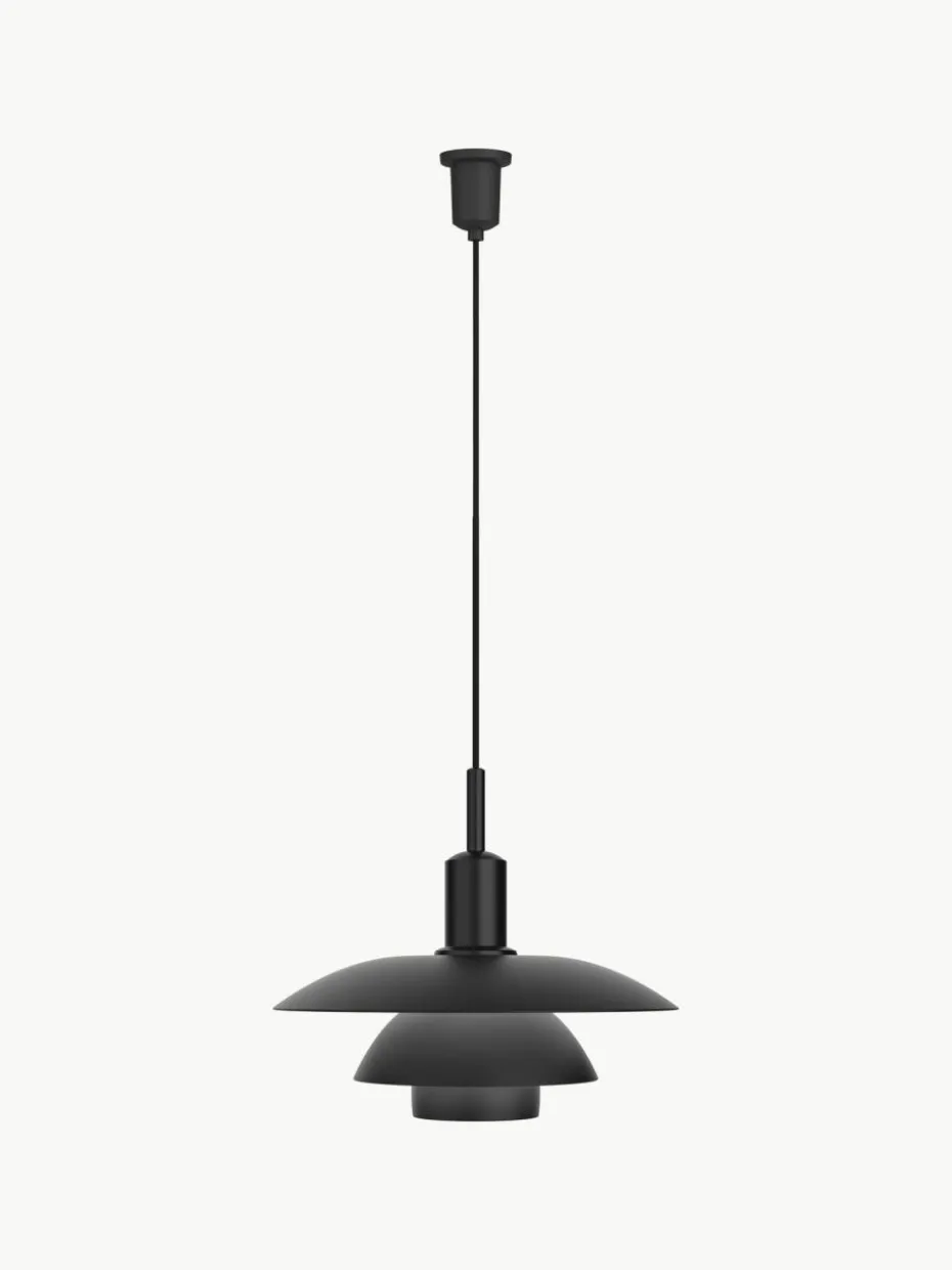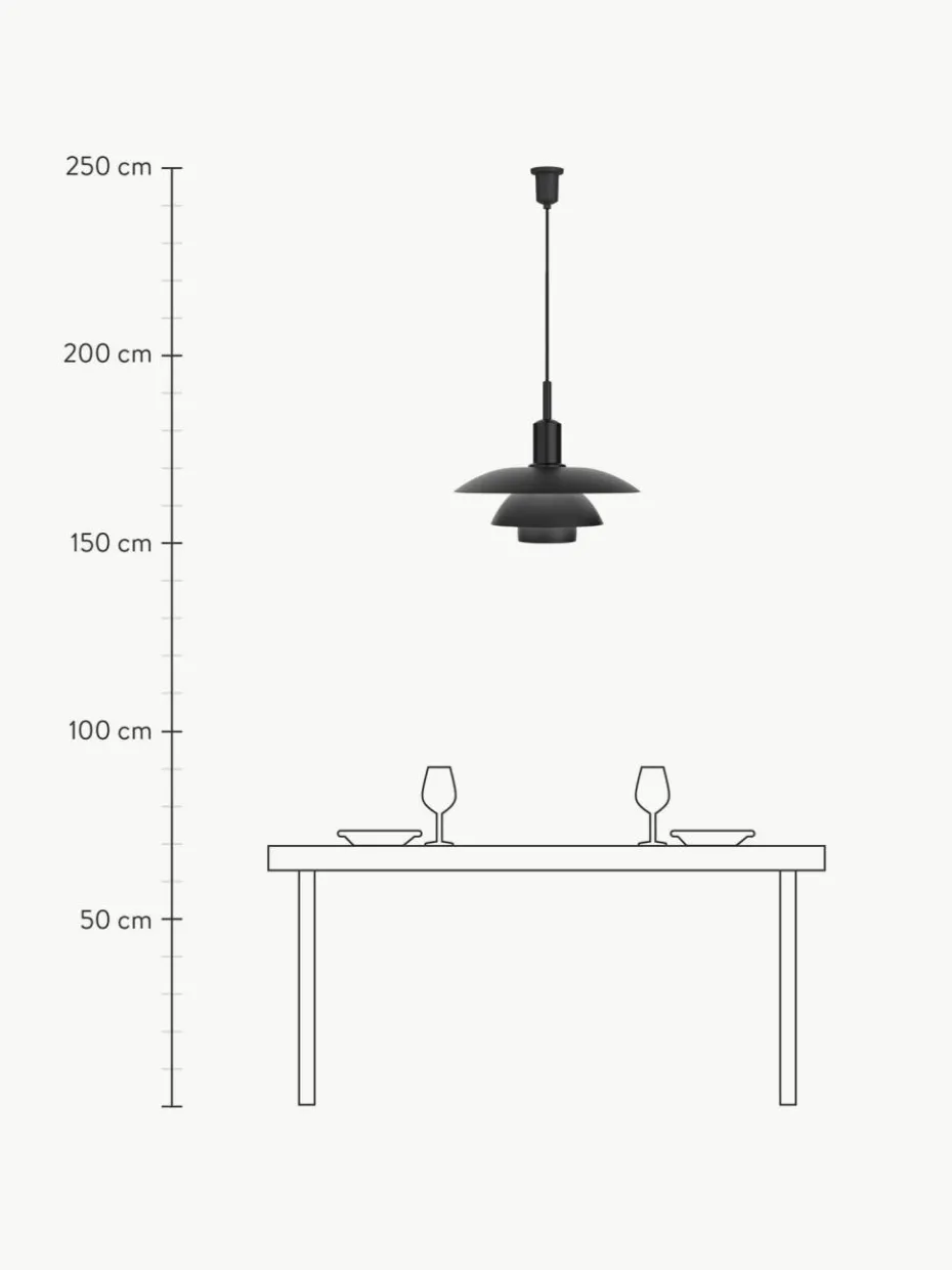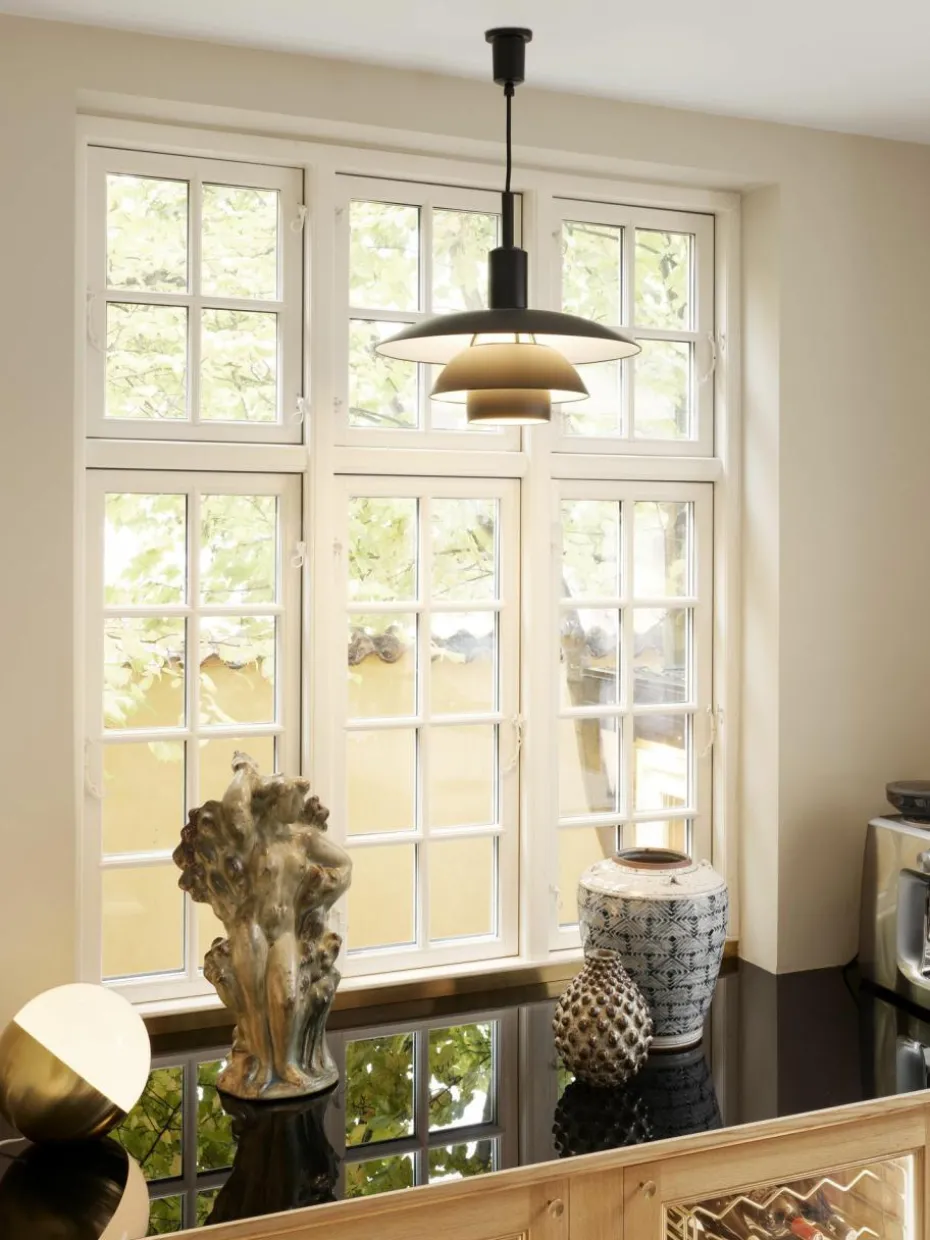Die Pendelleuchte strahlt blendfreies, nach unten gerichtetes Licht ab. Gleichzeitig beleuchtet sie ihren eigenen Rahmen und erzeugt so aus ihrem Zentrum einen weichen, angenehmen Lichtschein. Entworfen wurde die PH 5 von Poul Henningsen im Jahr 1958 als Reaktion auf die vielen Änderungen in Form und Größe von Glühbirnen.