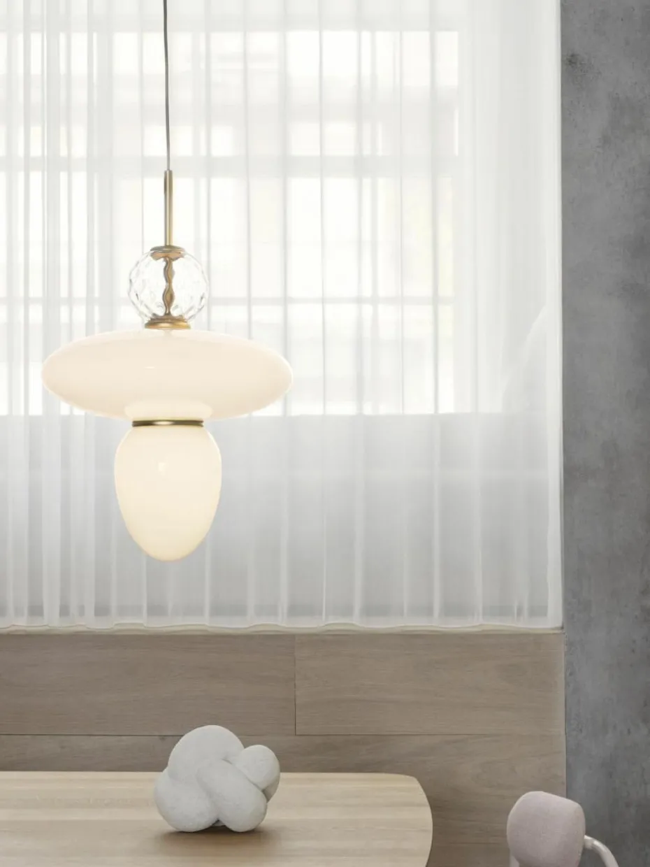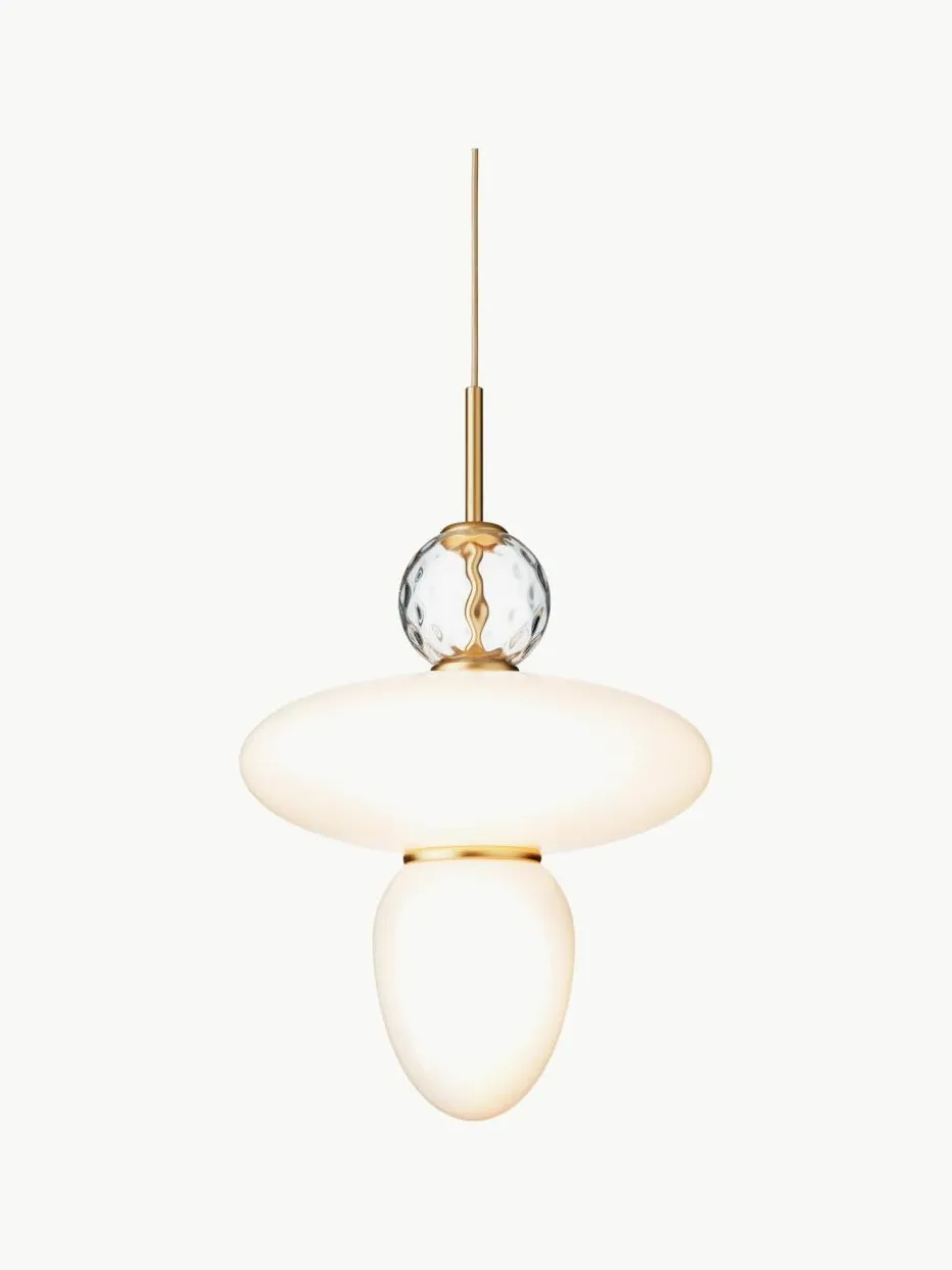 Dekorativer und geometrischer Anhänger des international renommierten Designers Paolo Rizzatto. Die Pendelleuchte RIZZATTO ist mit einem elliptischen Glasschirm in der Mitte gestaltet, an dem ein tropfenförmiges Glaselement angebracht ist. Dekorative Details umfassen ein klares, gemustertes Glasornament und satinierte Verzierungen. Der Lampenschirm besteht aus opalweißem Glas, das dem Raum ein weiches und gleichmäßiges Licht verleiht.