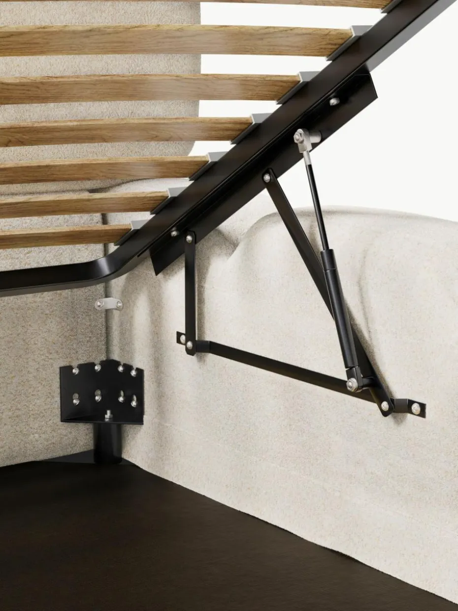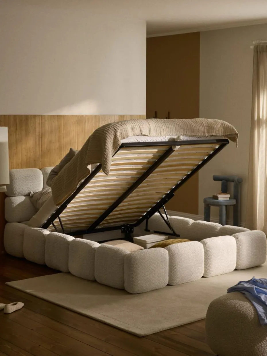 Das Polsterbett verfügt über eine Stauraumfunktion.