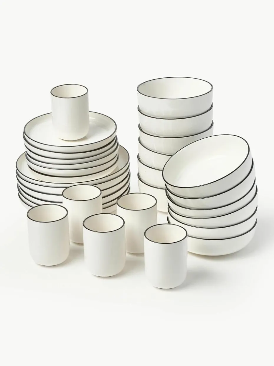 Dieses 30-teilige Geschirr-Set mit schwarzem Rand besteht aus 6 Speisetellern, 6 Suppentellern, 6 Desserttellern, 6 Müslischalen und 6 Kaffeetassen.“,“pdp_care_label“:“Spülmaschinengeeignet