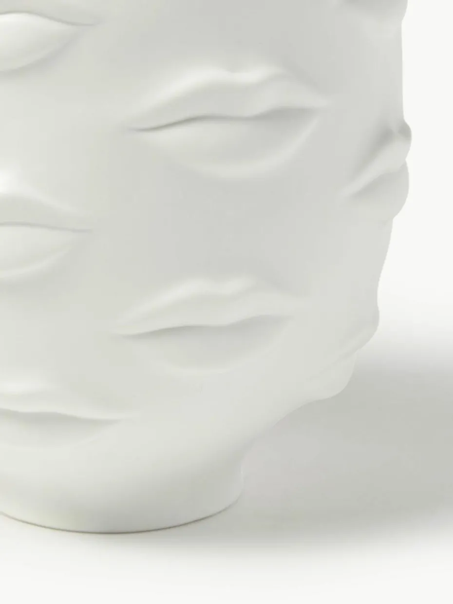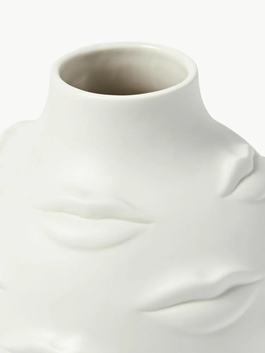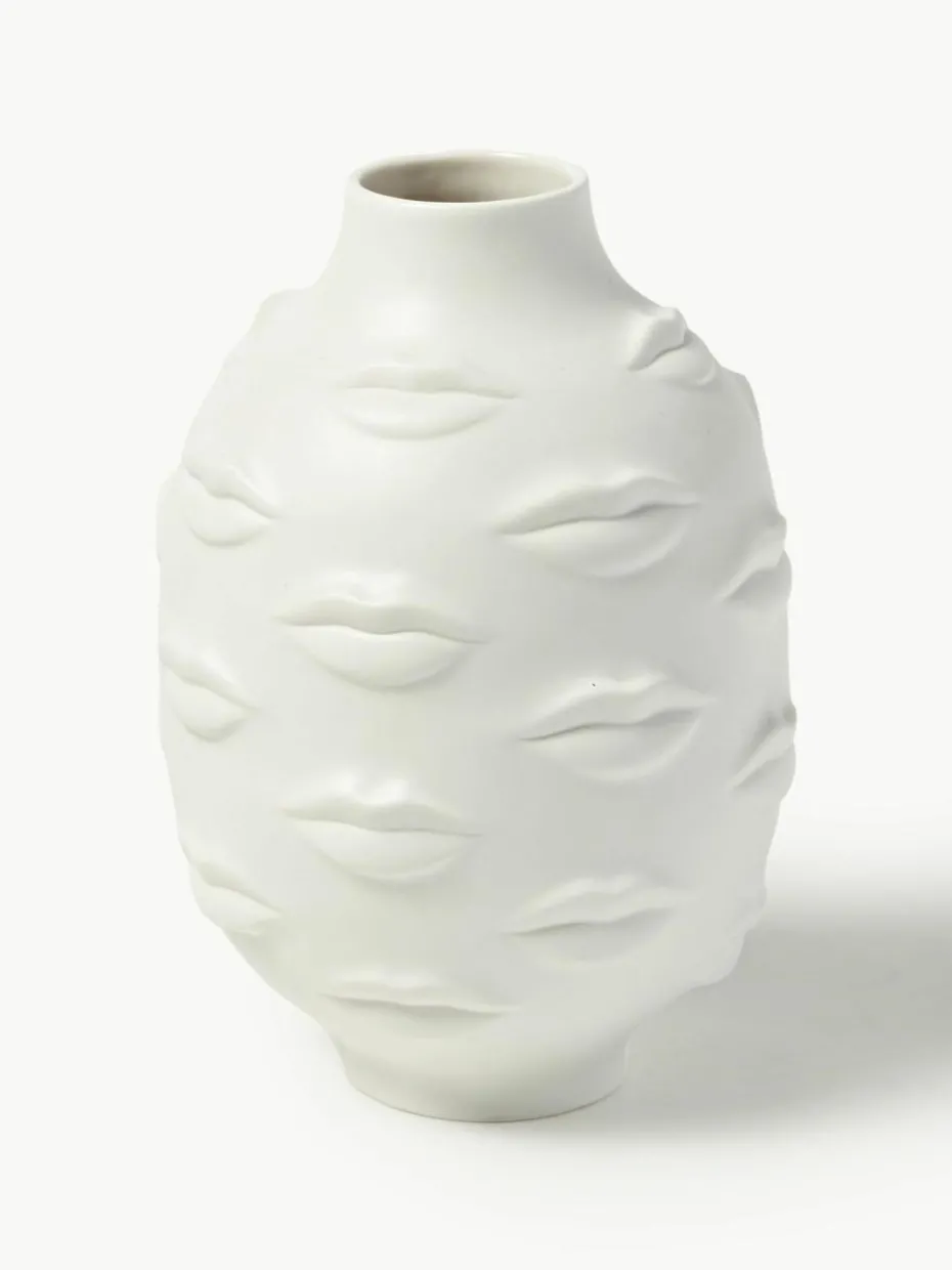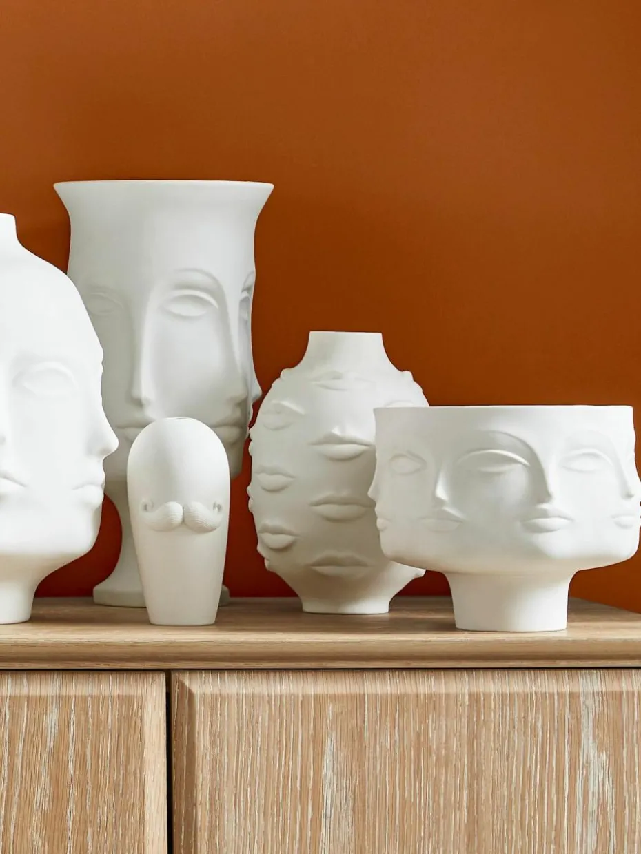 Gala ist eine ausdrucksstarke Sammlung aus hochgebranntem, unglasiertem Porzellan von stimmungsvollen Mündern, die das Gefäß umhüllt. Inspiriert von Gala, der Frau und Muse des surrealistischen Malers und Grafikers Salvador Dalí. Jonathan Adler modelliert und dreht die Modelle und ersetzt dann die charakteristischen geometrischen Reliefmuster durch Körperteile – Gesichter, Brüste, Lippen – um einen surrealen Stil zu schaffen.