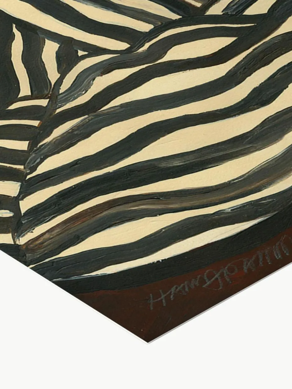 Dieses Poster stellt kunstvoll eine Figur in nachdenklicher Pose dar, gekleidet in ein gestreiftes Hemd, das mit dem Hintergrund verschmilzt und einen auffälligen visuellen Effekt erzeugt. Die warmen Töne und kräftigen Linien rufen ein Gefühl ruhiger Selbstbeobachtung hervor.