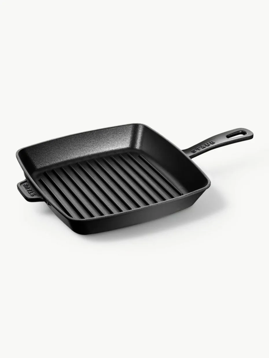 Die quadratische Grillpfanne besitzt Rillen, die dem Fleisch ein attraktives Muster wie vom Grill verleihen. Diese Rillen haben außerdem den Zweck, überschüssiges Fett abtropfen zu lassen. Sie eignet sich besonders gut zum scharfen Anbraten wegen ihrem Material. Zusätzlich werden die Innenseiten emailliert, damit nichts anbrennen kann. Selbst Anfängern gelingt in solch einer Pfanne daher mühelos ein saftiges Steak.