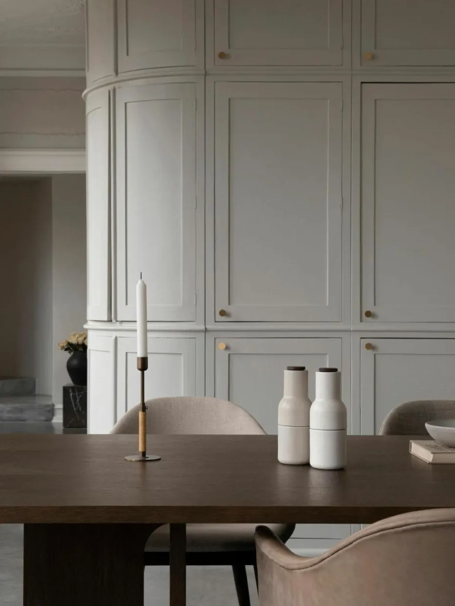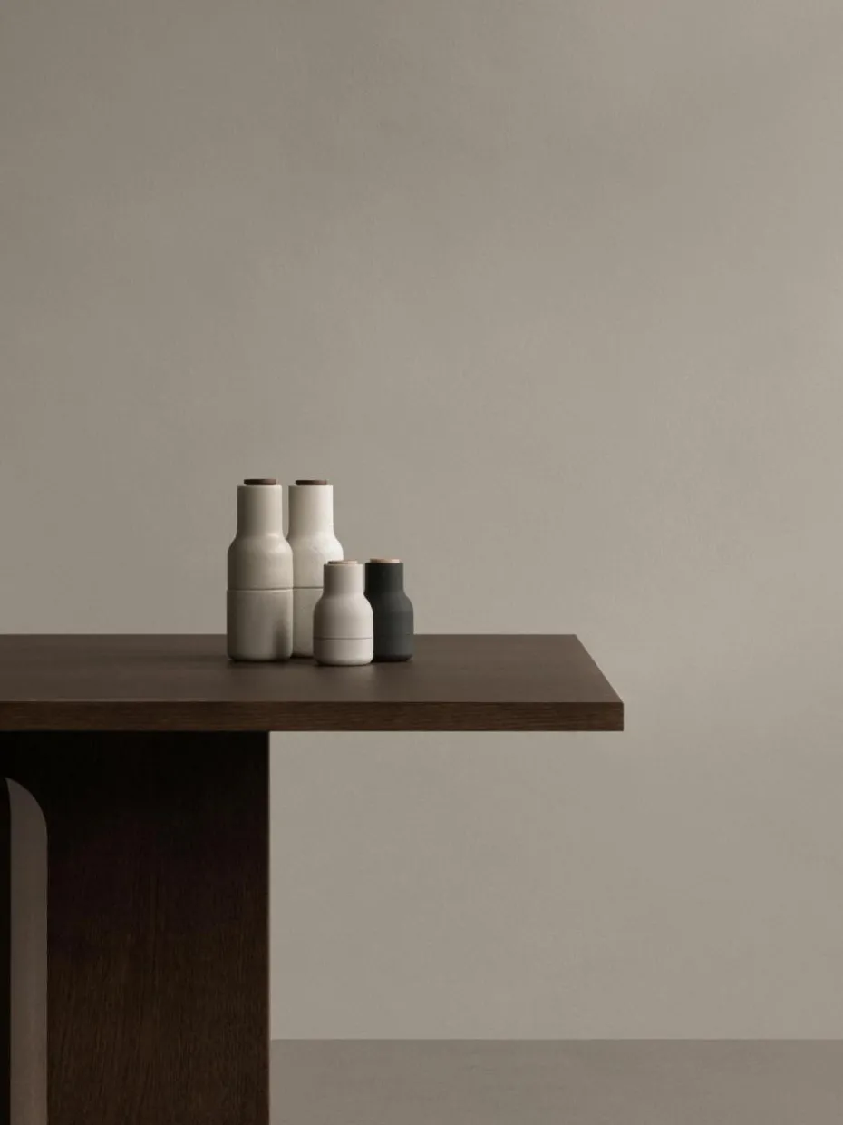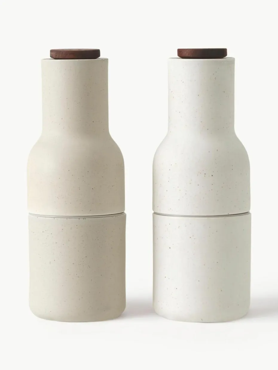 BOTTLE GRINDER ist ein zweiteiliges Set von Salz- und Pfeffermühlen, die jeweils mit einem leistungsstarken Keramikmahlwerk ausgestattet sind, das eine Vielzahl von Gewürzen mühelos mahlt. Das Set hat die Form von Flaschen, die bequem in der Hand liegen, und wird in einer Reihe von strapazierfähigen Materialien und Farben angeboten, darunter Barley, einem warmen und beruhigenden neutralen Farbton, der in jedes Küchendesign passt. Das aufrechte Design ist einfach zu bedienen, zu befüllen und zu reinigen und sorgt dafür, dass die Oberflächen frei von unerwünschten Rückständen bleiben, während die Speisen perfekt gewürzt werden.