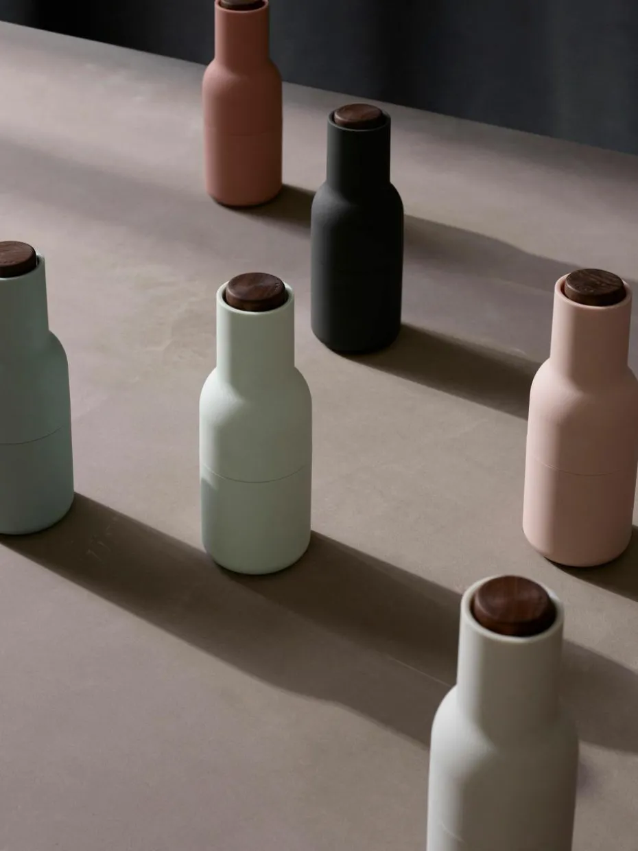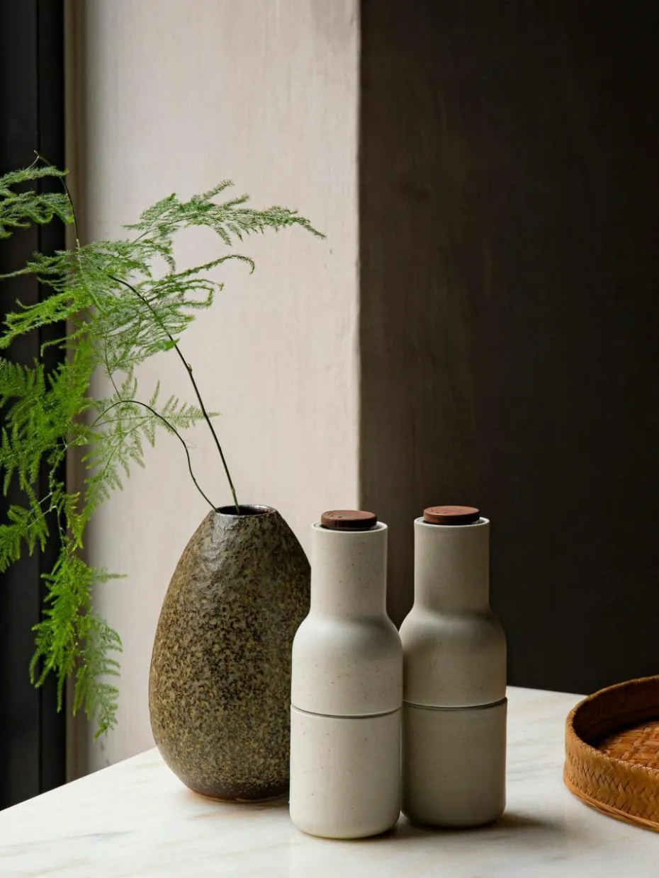 BOTTLE GRINDER ist ein zweiteiliges Set von Salz- und Pfeffermühlen, die jeweils mit einem leistungsstarken Keramikmahlwerk ausgestattet sind, das eine Vielzahl von Gewürzen mühelos mahlt. Das Set hat die Form von Flaschen, die bequem in der Hand liegen, und wird in einer Reihe von strapazierfähigen Materialien und Farben angeboten, darunter Barley, einem warmen und beruhigenden neutralen Farbton, der in jedes Küchendesign passt. Das aufrechte Design ist einfach zu bedienen, zu befüllen und zu reinigen und sorgt dafür, dass die Oberflächen frei von unerwünschten Rückständen bleiben, während die Speisen perfekt gewürzt werden.