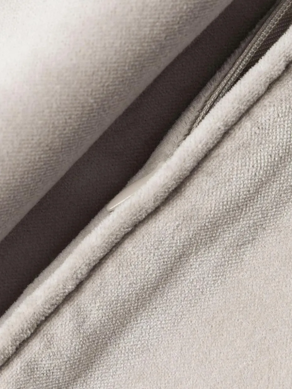 Die Samt-Kissenhülle mit Kederumrandung wird ohne Inlett geliefert und verfügt über einen Reißverschluss.