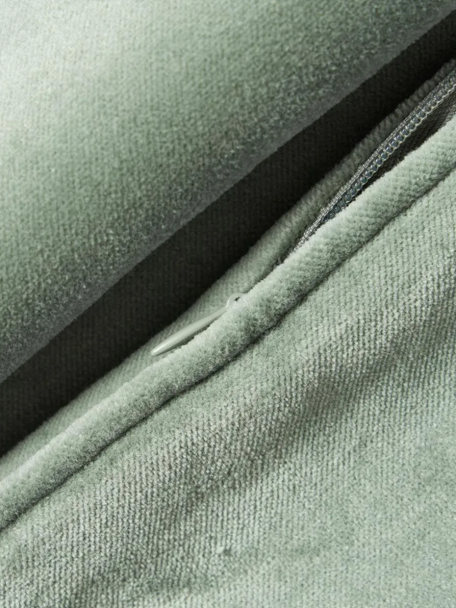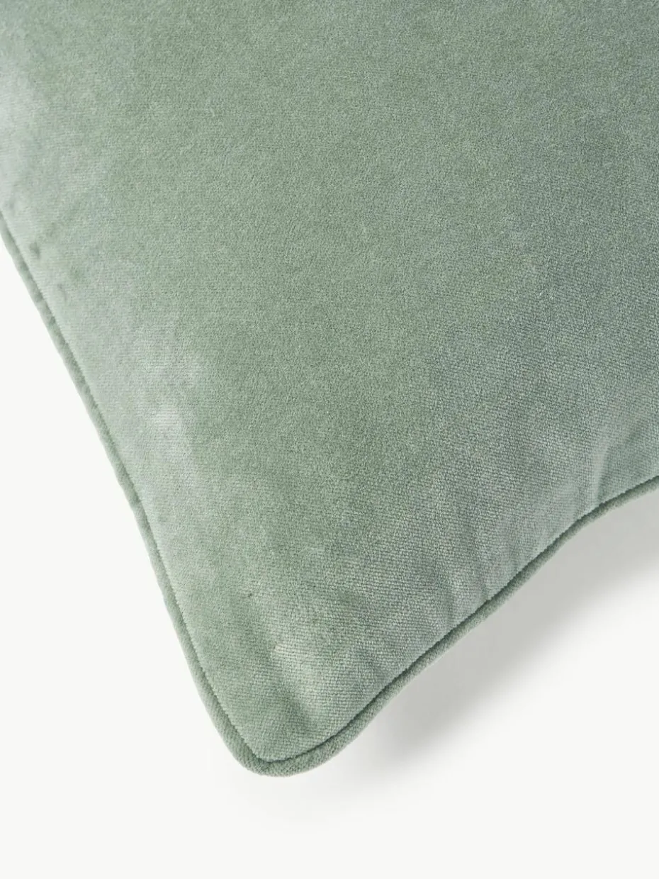 Die Samt-Kissenhülle mit Kederumrandung wird ohne Inlett geliefert und verfügt über einen Reißverschluss.