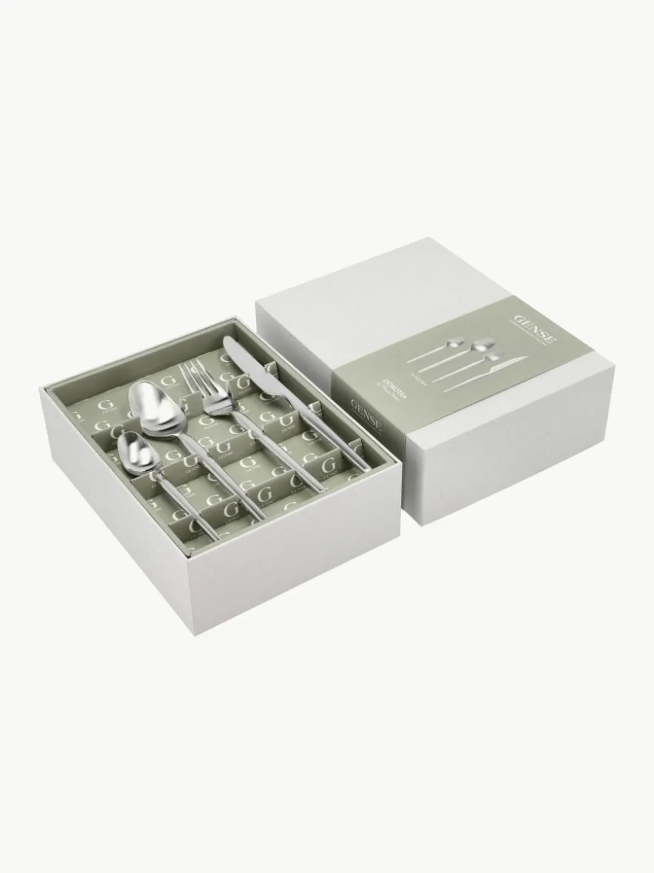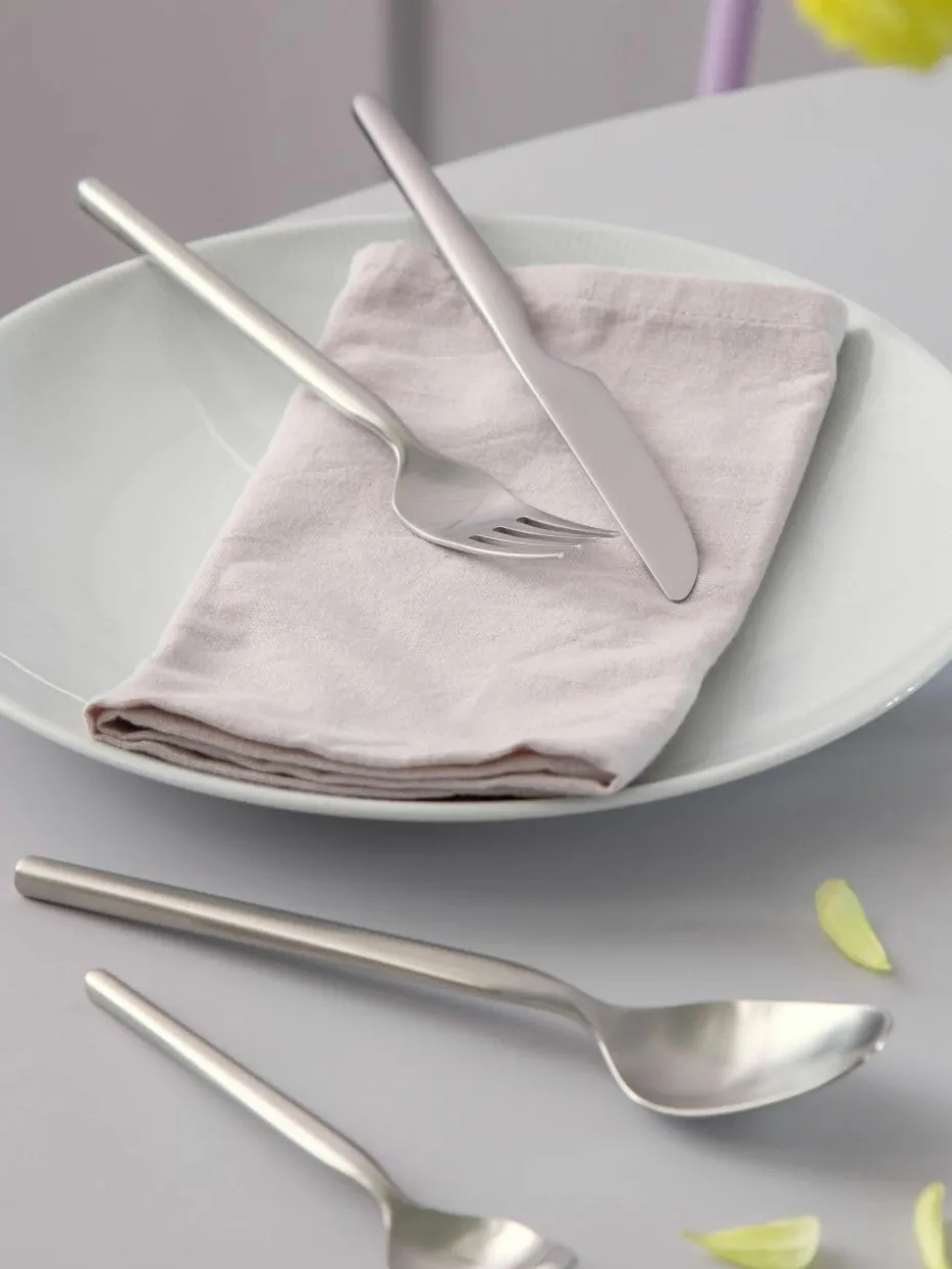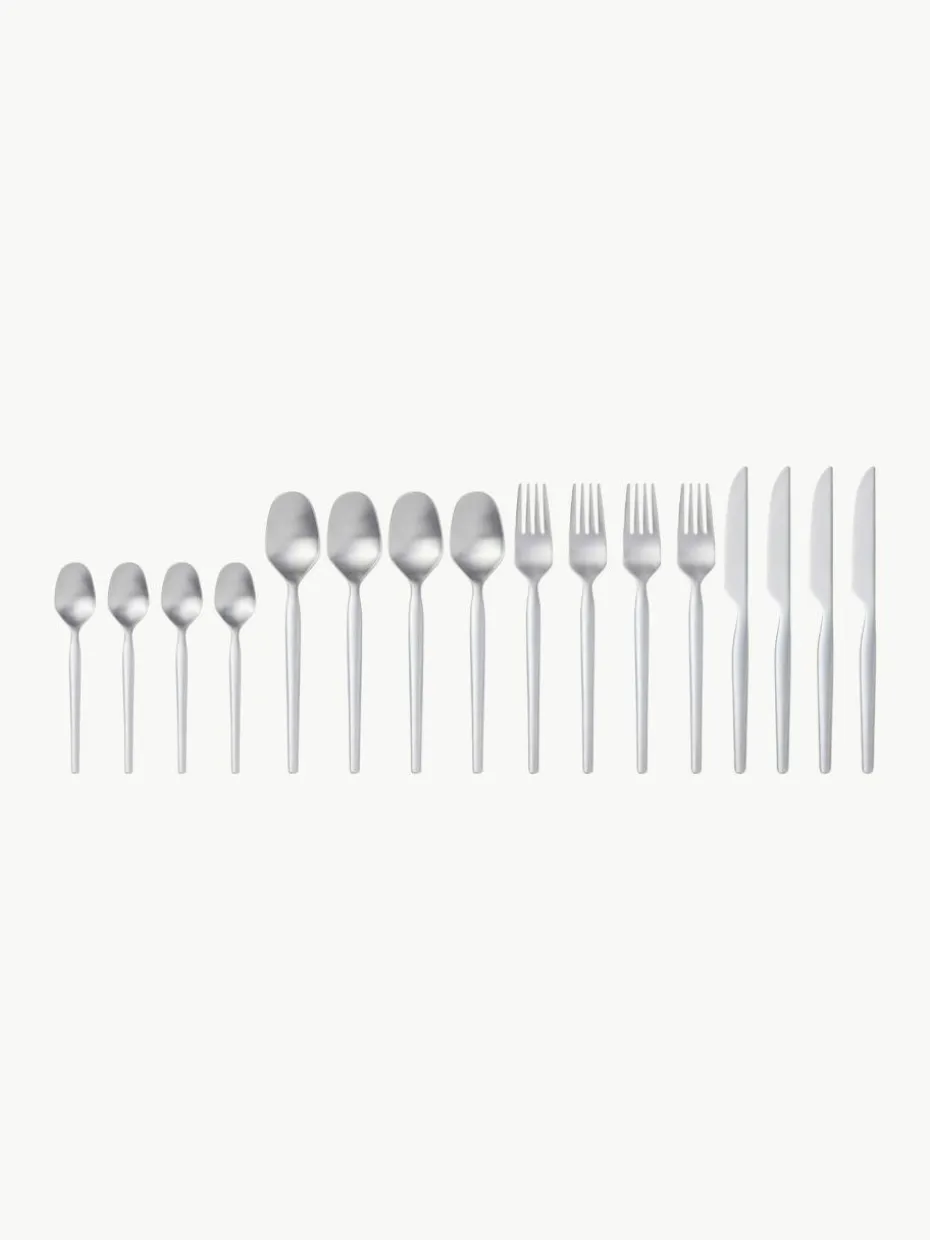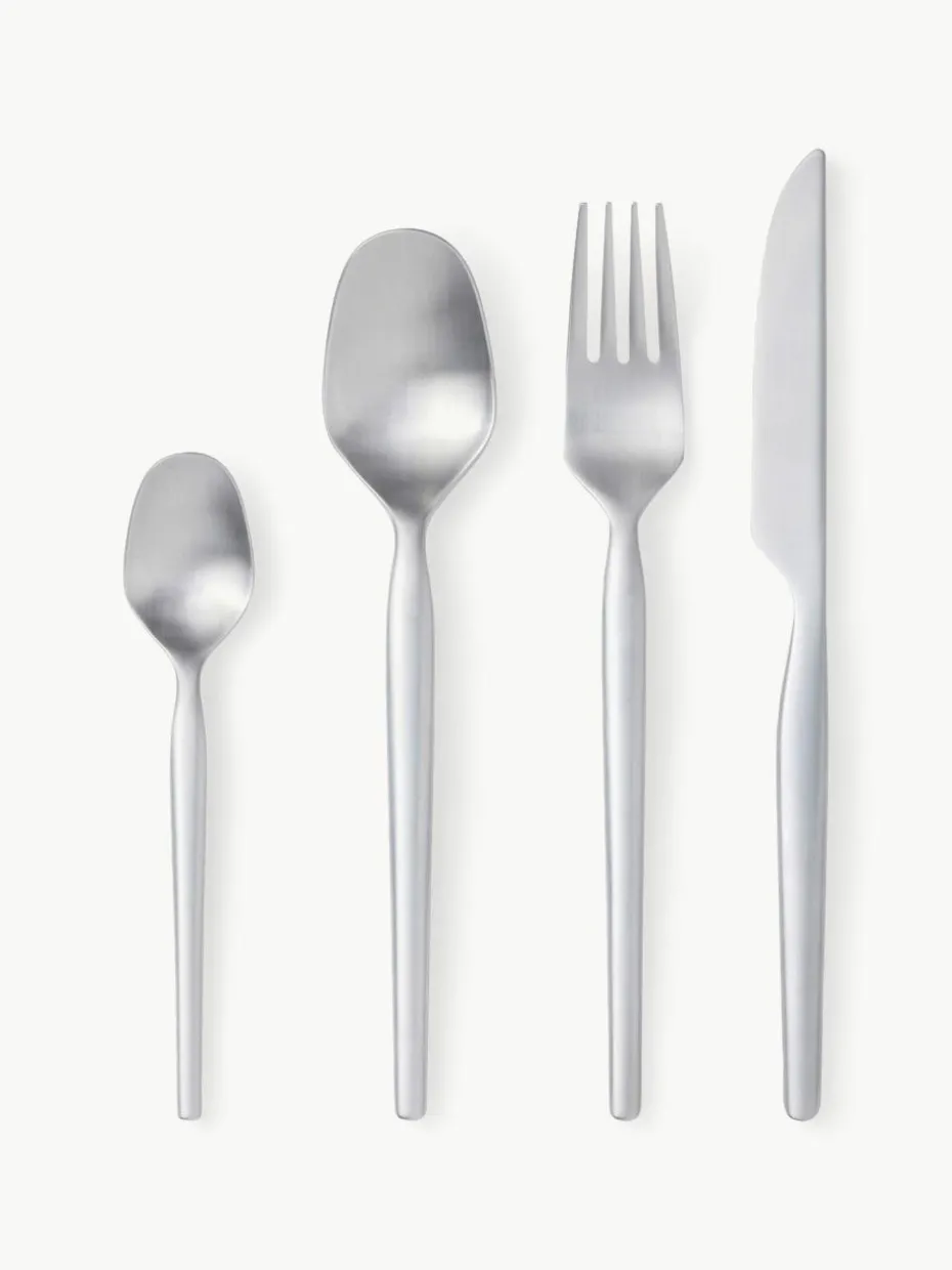Dieses 16-teilige Besteck-Set mit satinierter Oberfläche besteht aus je vier Tafelmessern, vier Tafelgabeln, vier Tafellöffeln und vier Teelöffeln.“,“pdp_care_label“:“Spülmaschinengeeignet