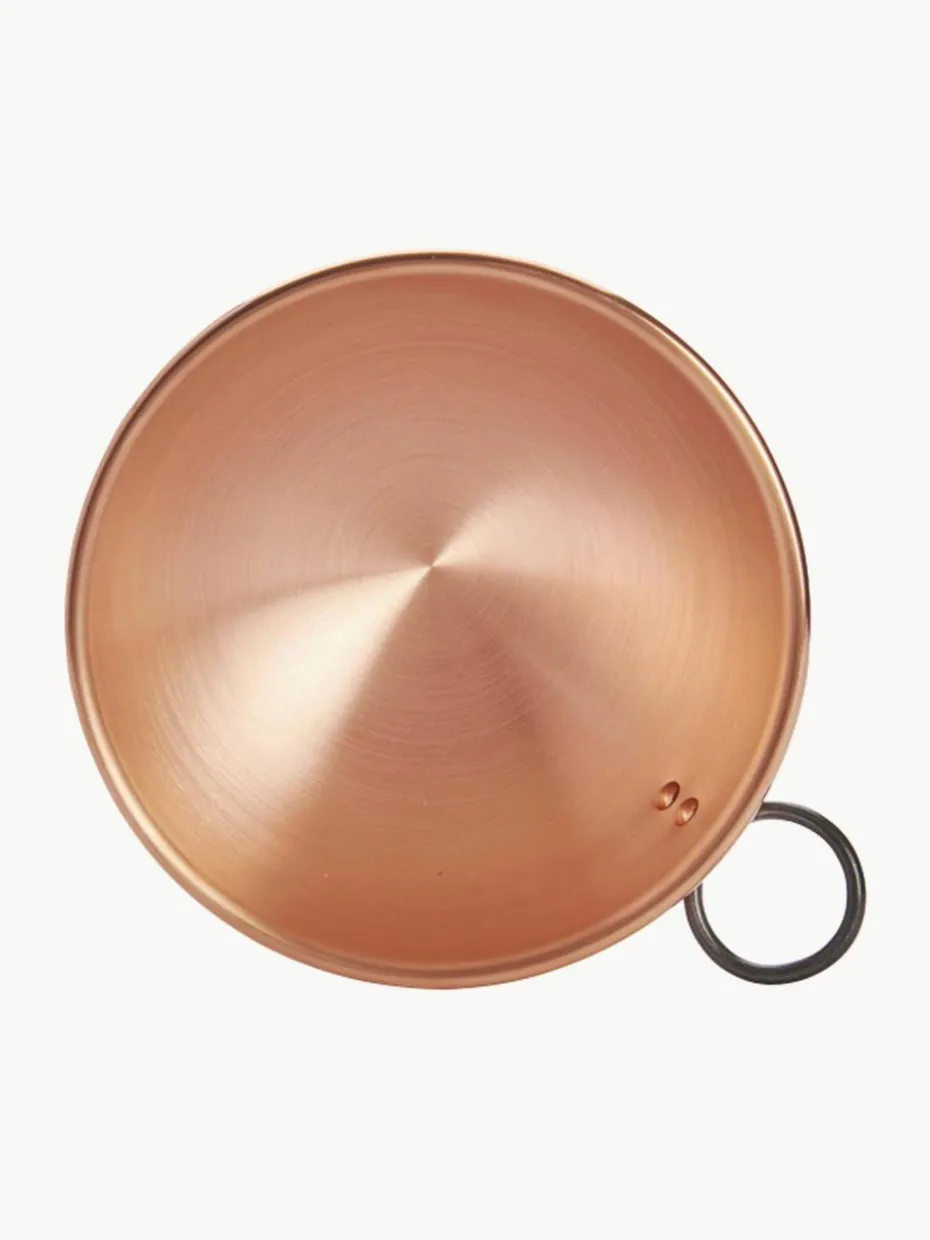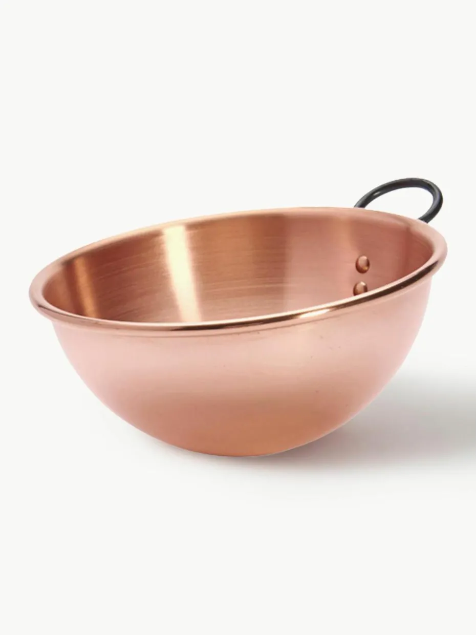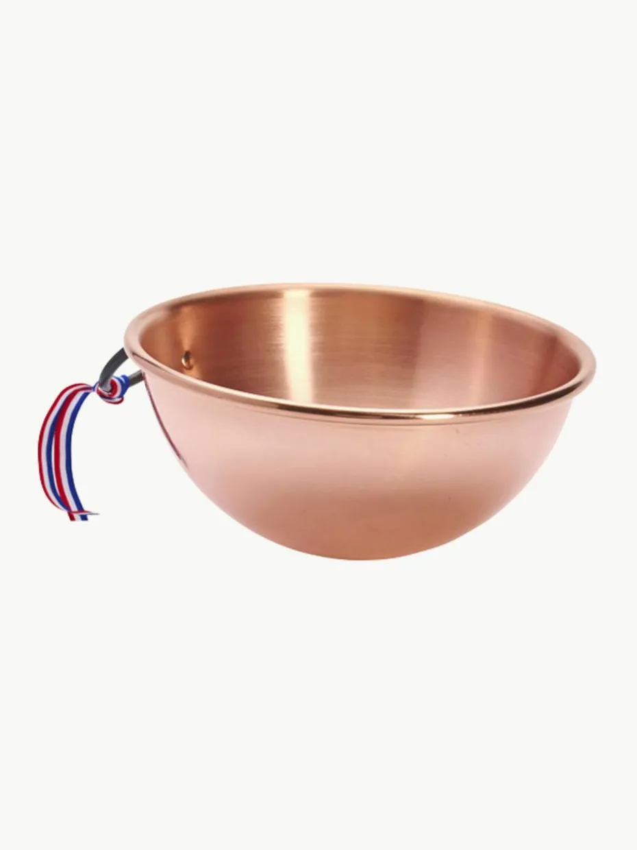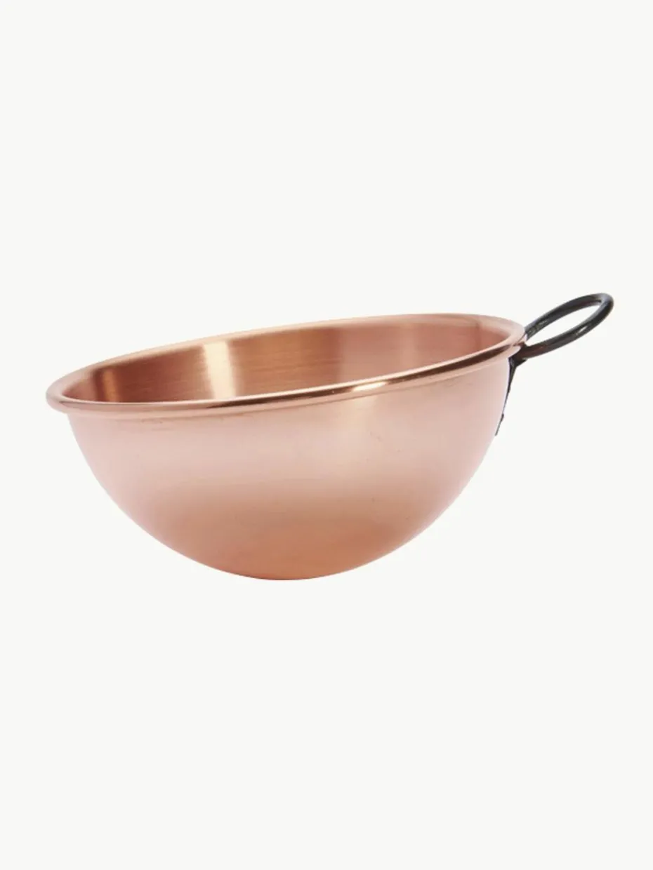 Eischnee-Schüssel aus massivem Kupfer mit vernieteten Griffen. Ideal zum schnellen Schlagen von Eischnee. Ein traditionelles Profi-Utensil, ideal zum horizontalen Schlagen. Das Kupfer sorgt dafür, dass der Eischnee schneller geschlagen, fester und weißer wird. In der traditionellen Halbkugelform, in der Luft in den Eischnee inkorporiert werden kann, die ganze Zubereitung kann einfach und ohne Überlaufen geschlagen werden. Robust, für intensiven Einsatz. Breite Griffe oder ein Ring aus Stahlguss: erleichterte Handhabung; sichere Verwendung. Gerollter, offener Rand: ergonomisch, hygienisch und funktionell, sichere, feste, einfache und bequeme Handhabung für dynamisches Schlagen.“,“pdp_care_label“:“Von Hand spülen