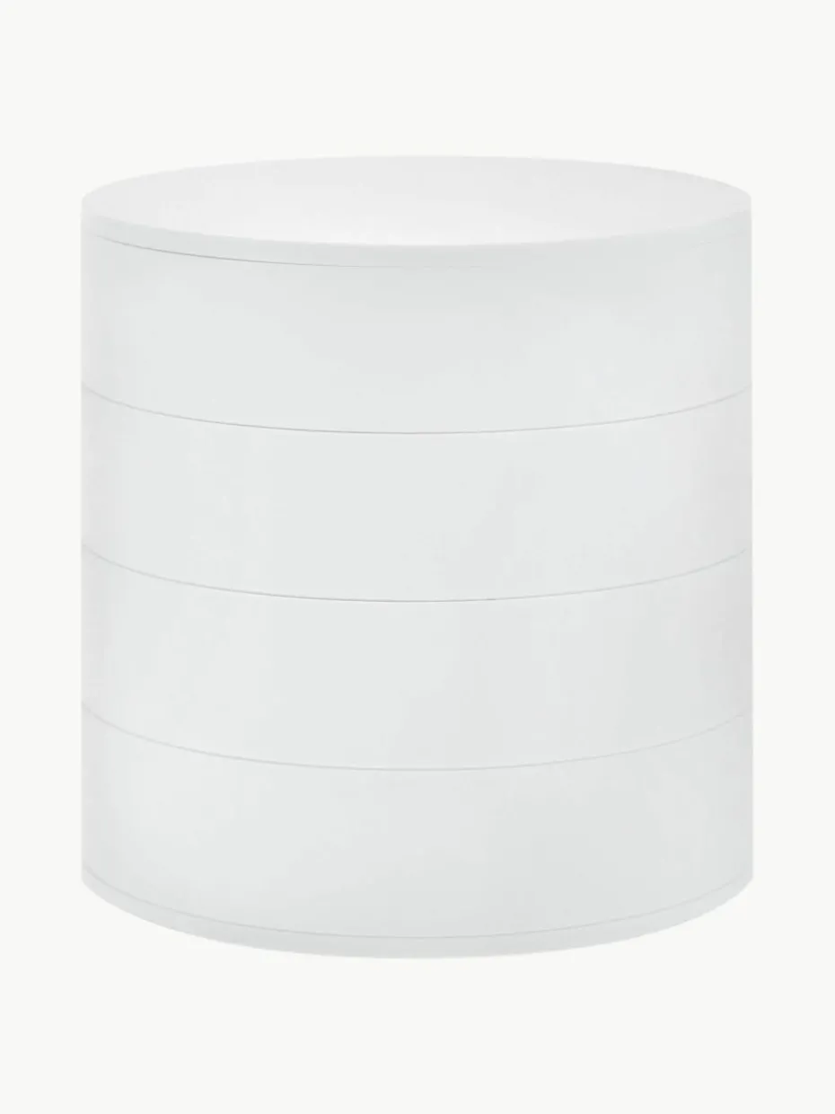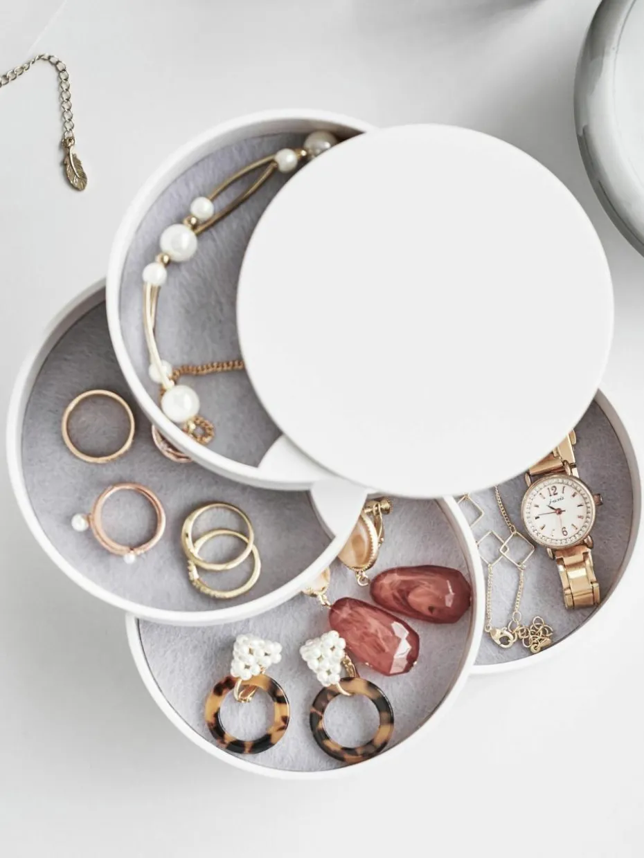Die kleine Schmuckdose ist mit vier um 360 Grad aufschiebbaren Fächern und Einlagen ausgestattet.