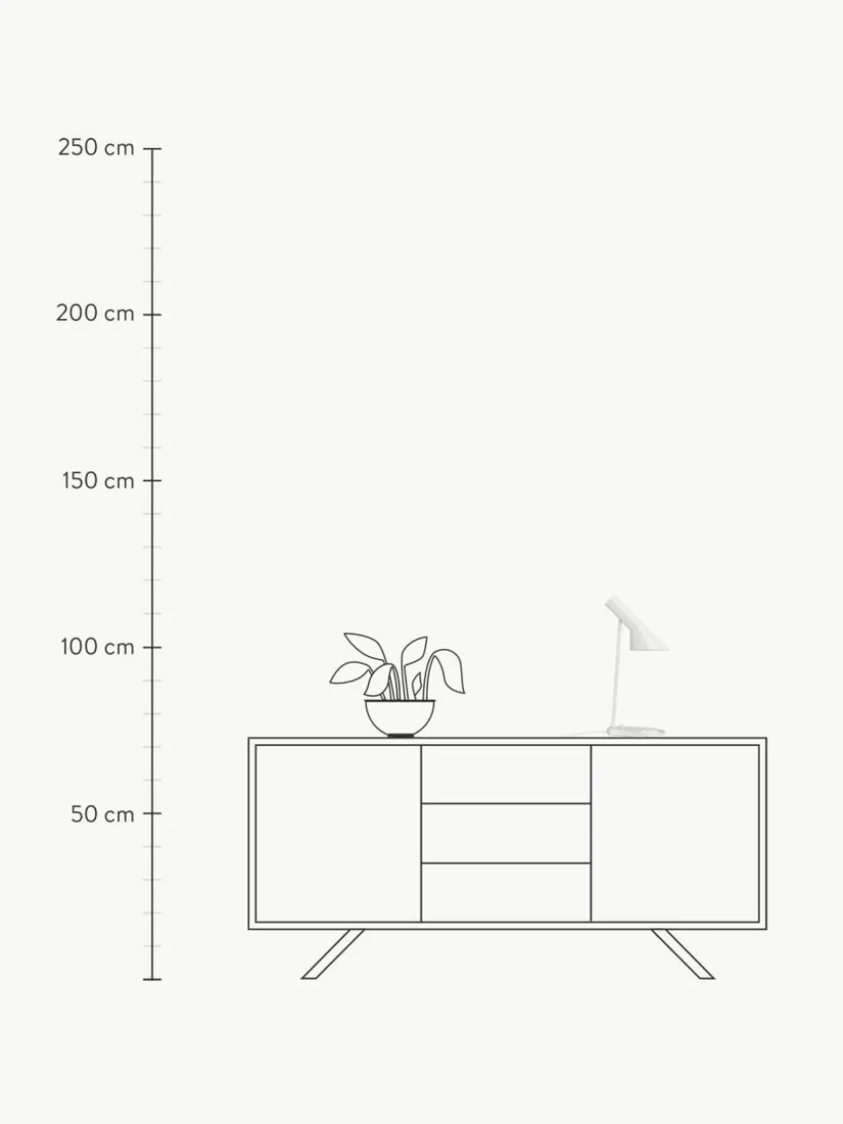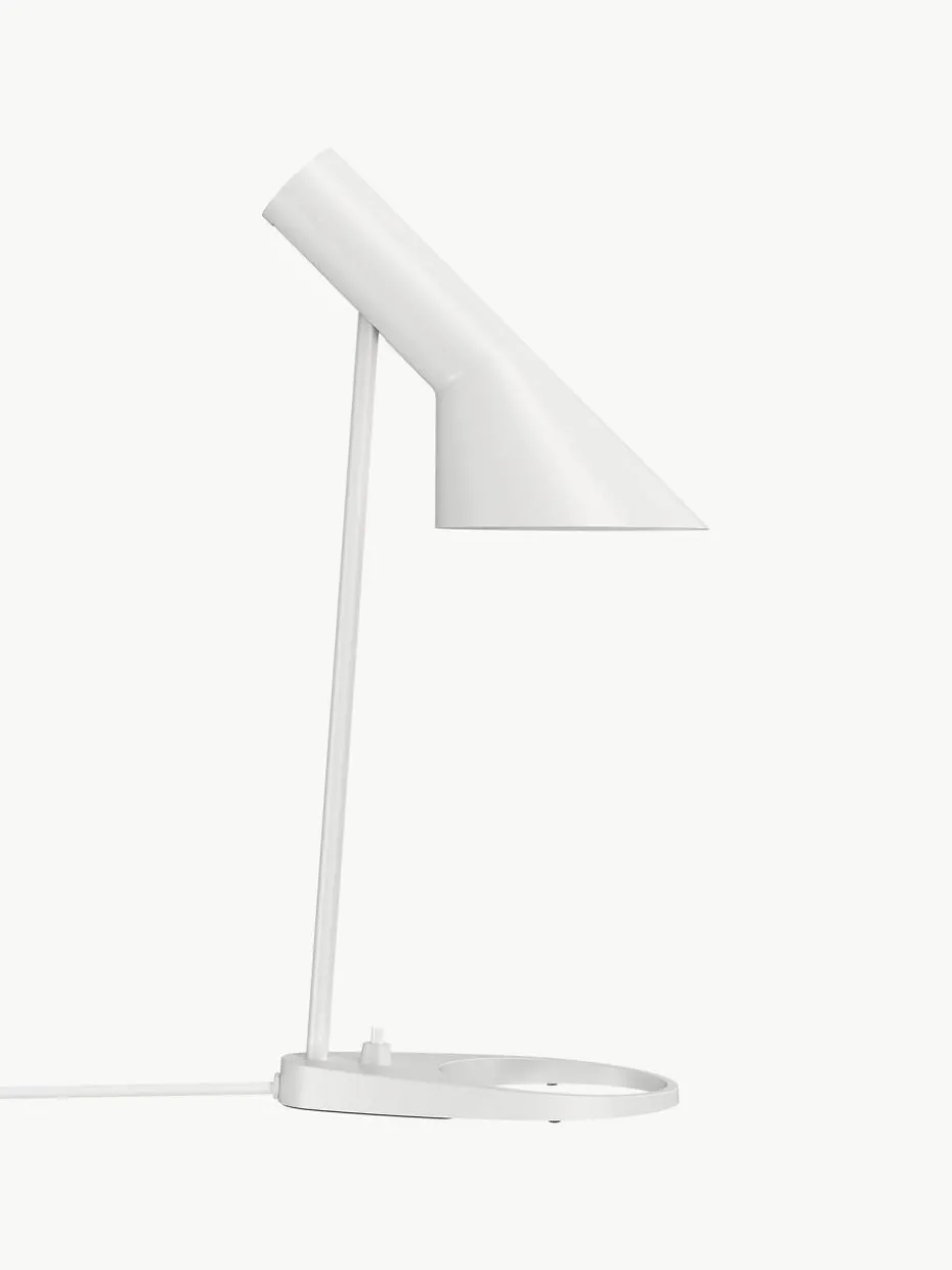 Die AJ Leuchte wurde 1957 für das SAS Royal Hotel in Kopenhagen entworfen und ist ein legendäres Design von Arne Jacobsen. Das grafische und stilreine Design verleiht der Lampe einen zeitlosen Look. Die AJ Tischleuchte sorgt für ein nach unten gerichtetes Licht, wobei die Neigung des Lampenschirms individuell angepasst werden kann. Durch die weiße Lackierung auf der Innenseite des Schirms wird ein gleichmäßiges, weiches Licht erzeugt.