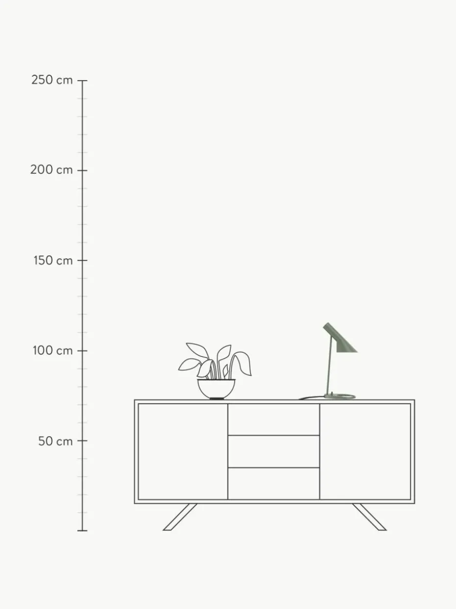 Die AJ Leuchte wurde 1957 für das SAS Royal Hotel in Kopenhagen entworfen und ist ein legendäres Design von Arne Jacobsen. Das grafische und stilreine Design verleiht der Lampe einen zeitlosen Look. Die AJ Tischleuchte sorgt für ein nach unten gerichtetes Licht, wobei die Neigung des Lampenschirms individuell angepasst werden kann. Durch die weiße Lackierung auf der Innenseite des Schirms wird ein gleichmäßiges, weiches Licht erzeugt.