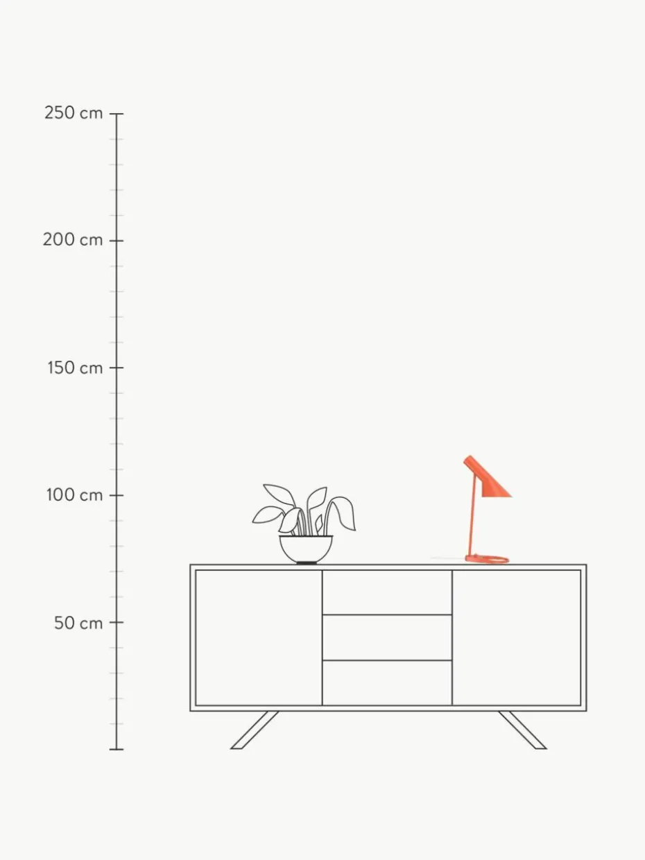 Die AJ Leuchte wurde 1957 für das SAS Royal Hotel in Kopenhagen entworfen und ist ein legendäres Design von Arne Jacobsen. Das Design ist grafisch und stilrein in seinem Ausdruck, was ihm einen zeitlosen Look verleiht. Die AJ Tischleuchte sorgt für ein nach unten gerichtetes Licht. Die Neigung des Schirms kann individuell angepasst werden. Der Schirm ist auf der Innenseite weiß lackiert, wodurch ein gleichmäßiges, weiches Licht erzeugt wird.