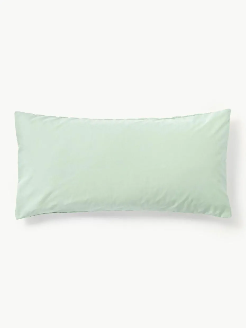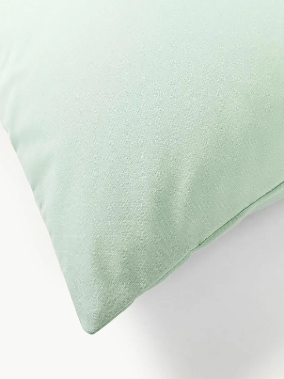 Der Baumwoll-Kopfkissenbezug mit verschiedenen Webarten auf Vorder- und Rückseite verfügt über einen Knopfverschluss.