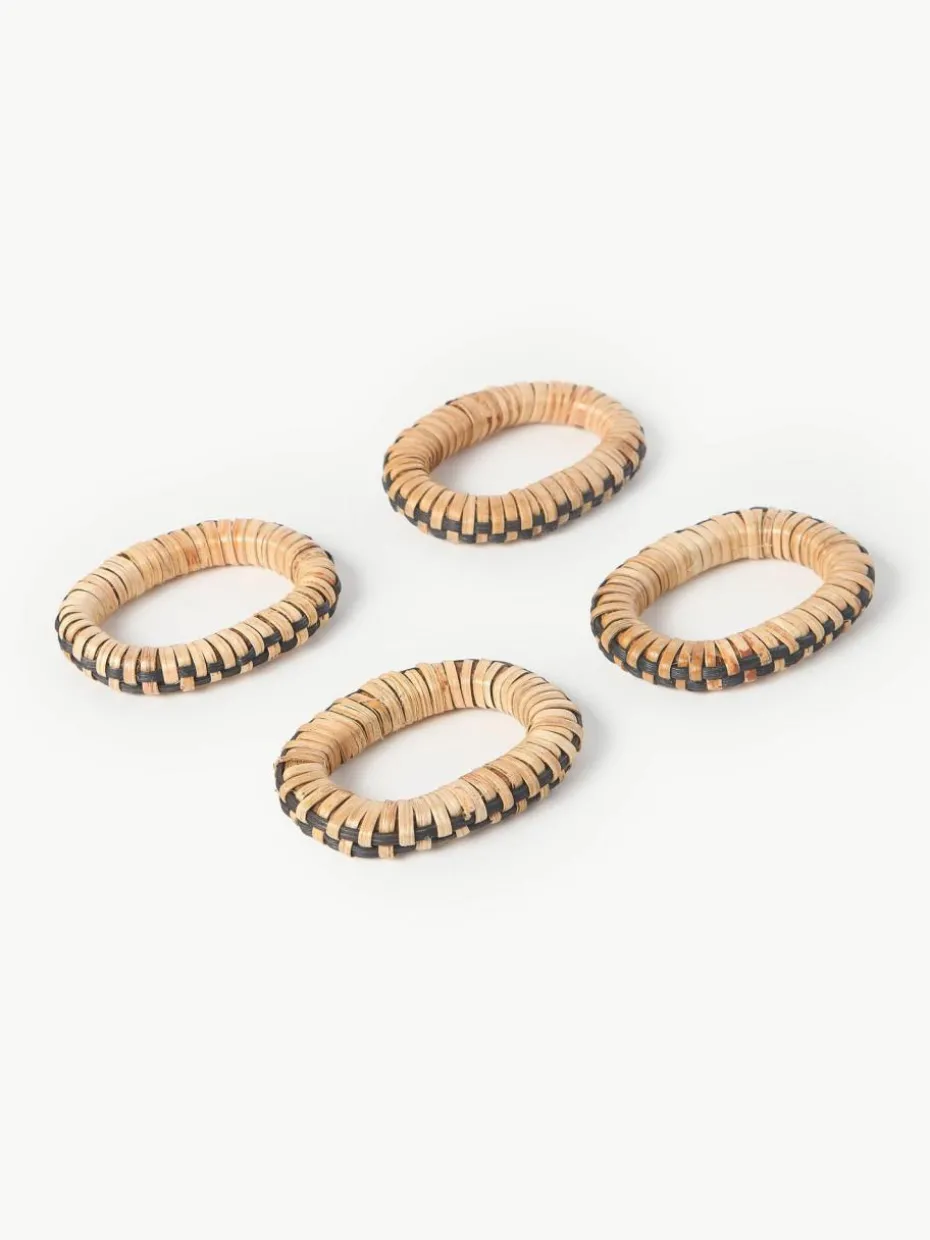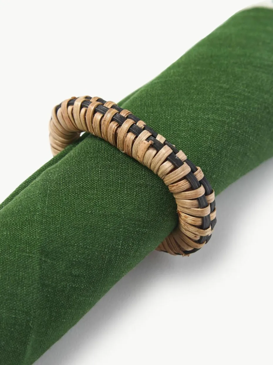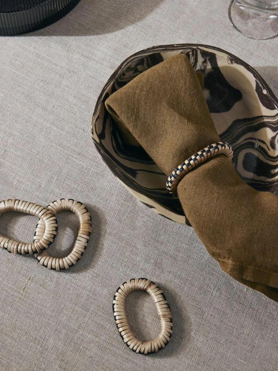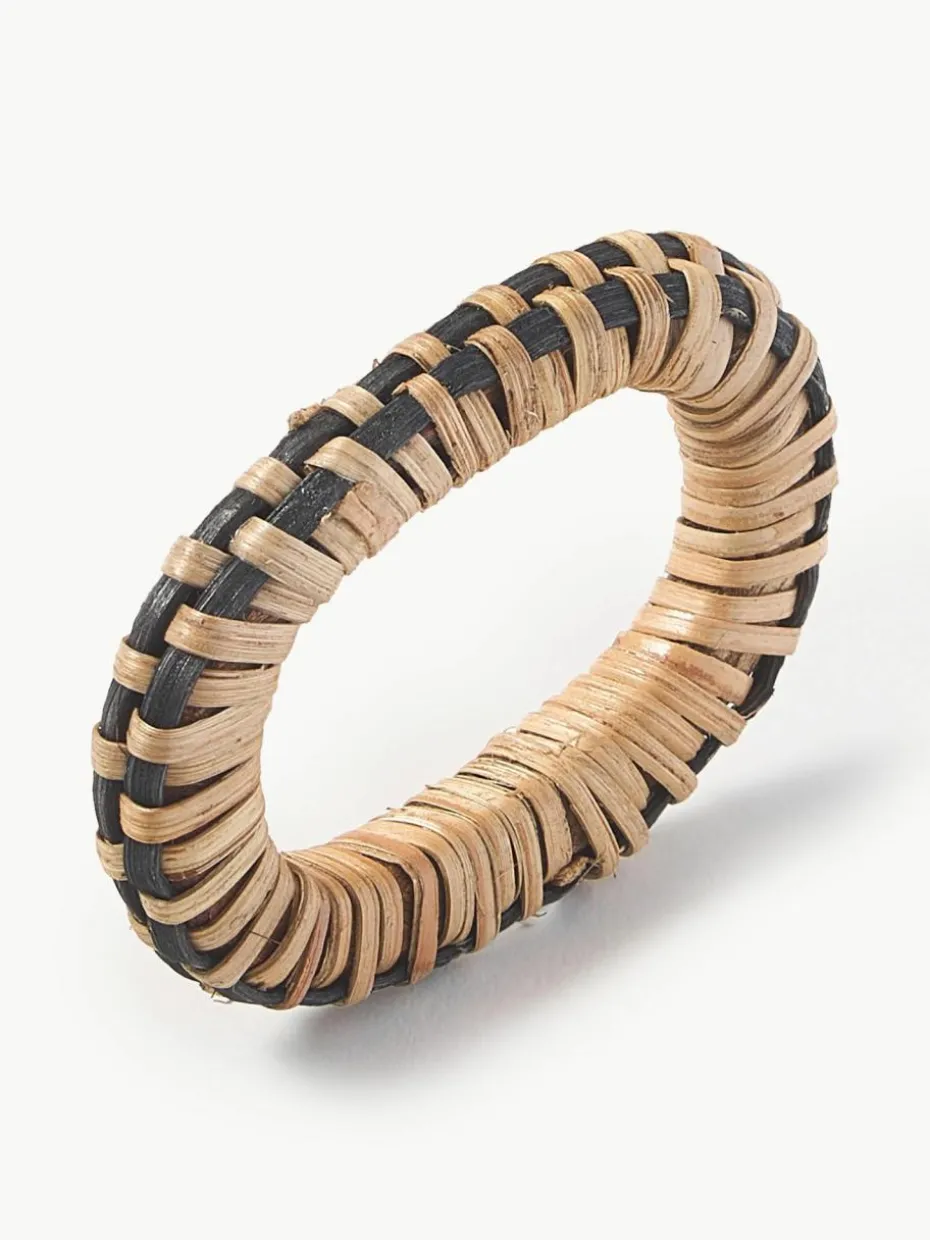 Werte Dein Tischgedeck mit einer charmanten Mischung aus Boho- und Vintage-Ästhetik auf. Die Weave-Serviettenringe aus geflochtenem Rattan bieten eingewebte schwarze Details und verleihen unmittelbar Akzente von Struktur und Taktilität.