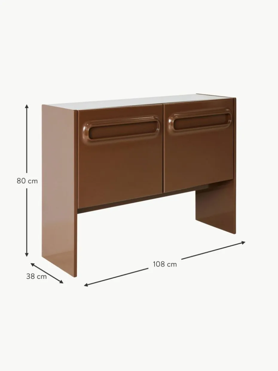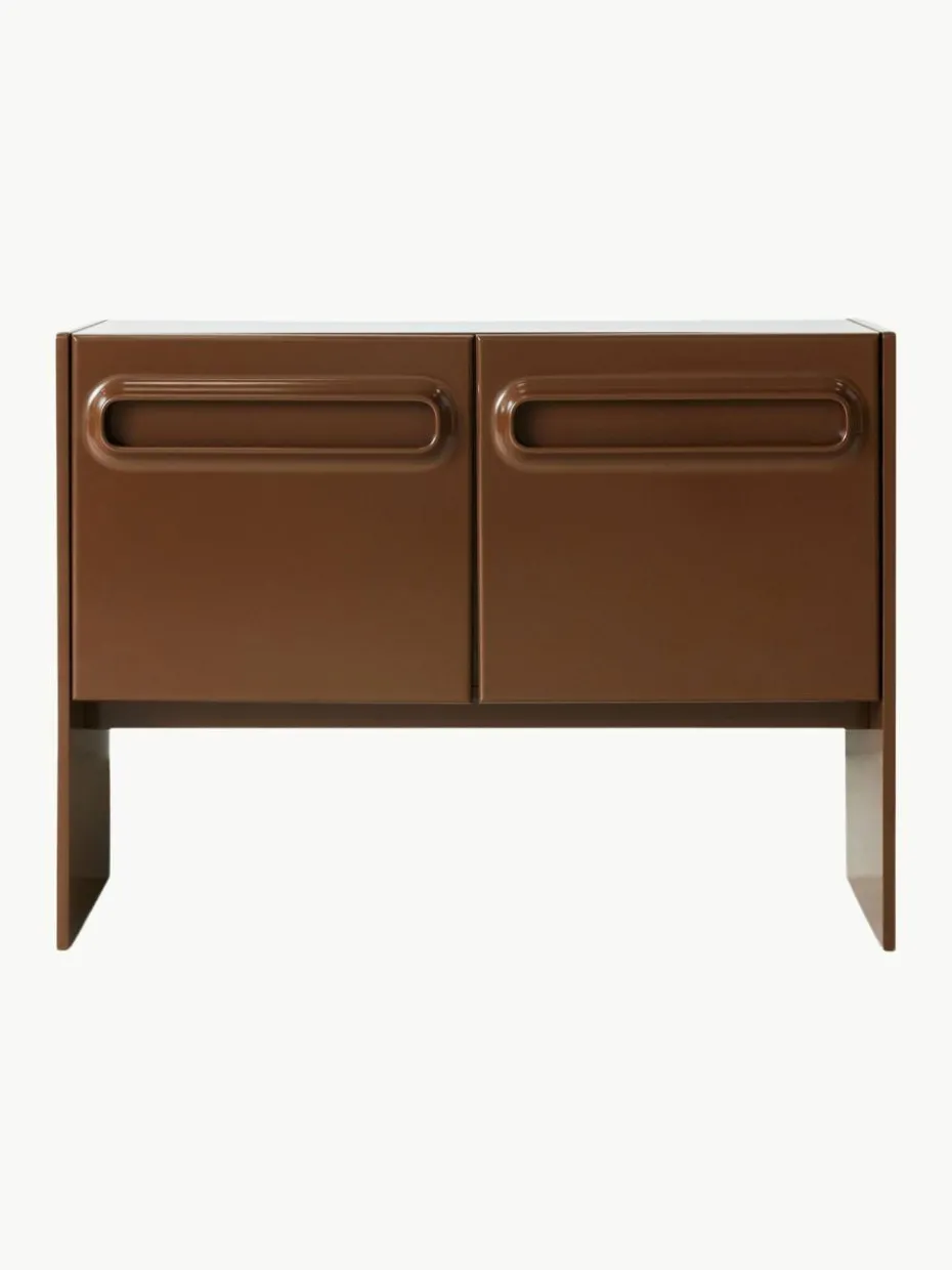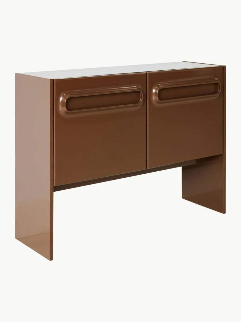 Gefertigt mit schlanken, klaren Linien und einem reichen Finish, strahlt diese Kommode eine Wärme und Raffinesse aus, die zeitlos ist. Die Inspiration des Weltraum-Designs zeigt sich in der stromlinienförmigen Silhouette und der Verwendung von glatten, reflektierenden Oberflächen, die an die außergewöhnlichen Formen der Weltraumforschung der 60er- und 70er-Jahre erinnern. Diese kompakte Kommode ist perfekt für diejenigen, die minimalistisches Design schätzen, aber praktische Aufbewahrungslösungen benötigen.