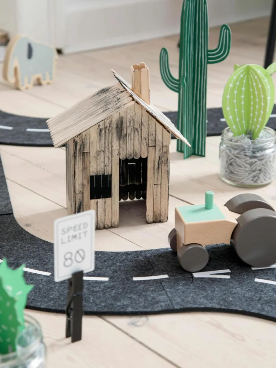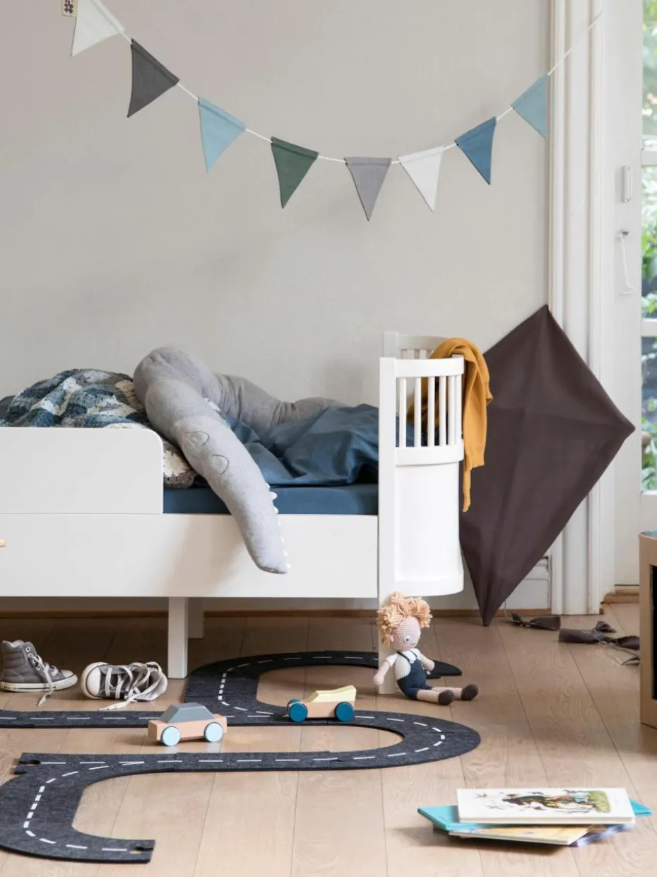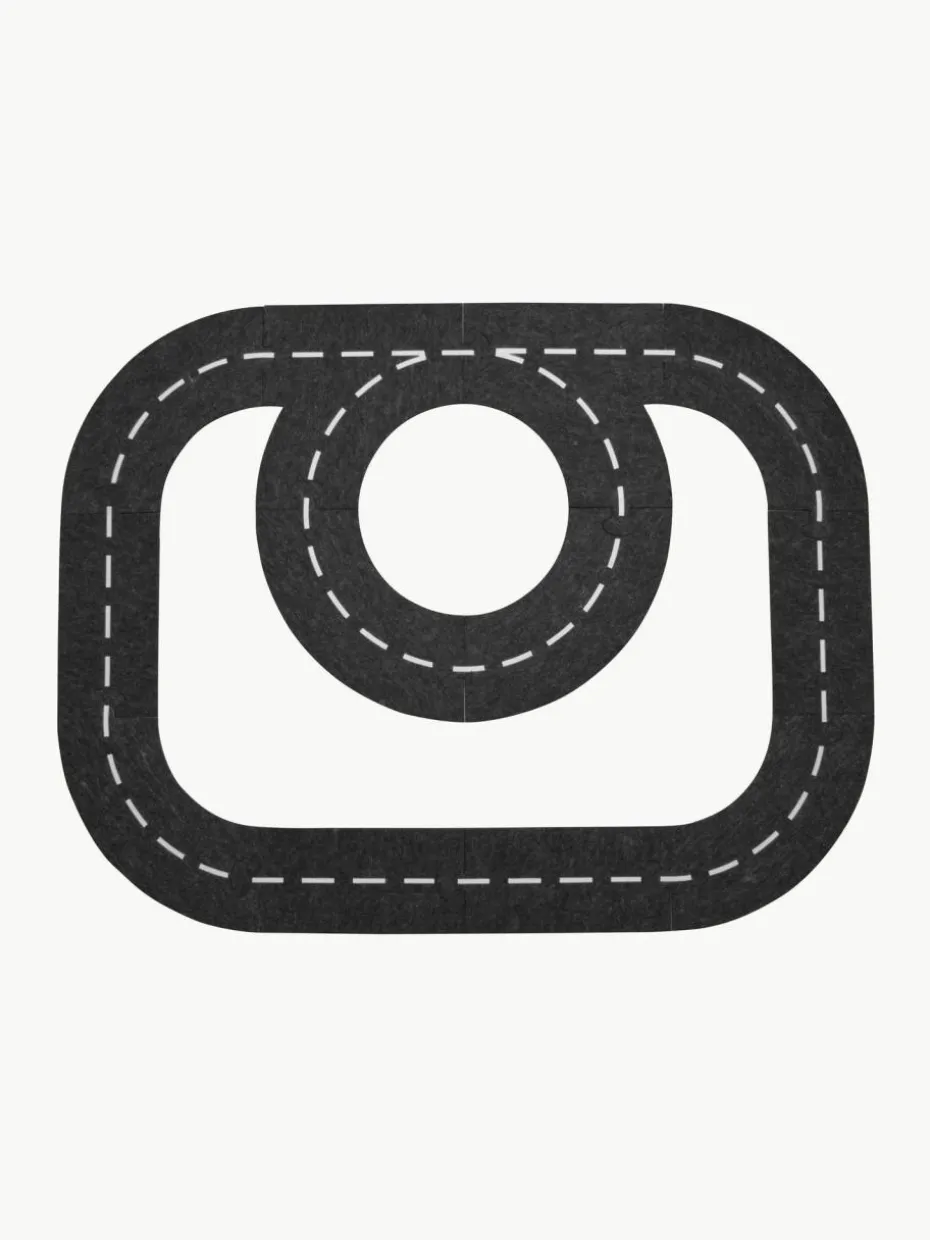 Das Set beinhaltet gerade und gebogene Fahrbahnteile sowie Ausfahrten, die sich wie ein Puzzle in vielfältiger Weise zusammensetzen lassen.