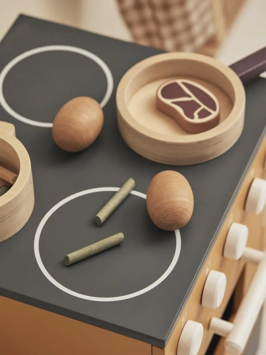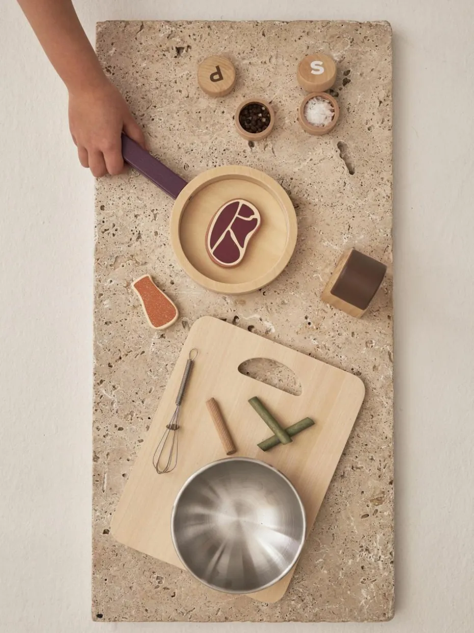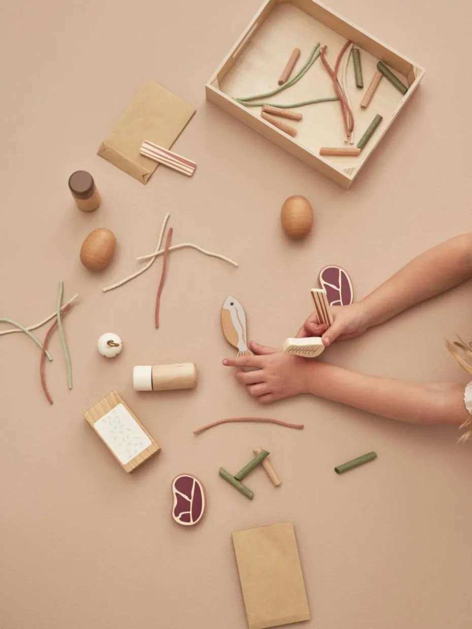 Das Spielzeug-Set FOOD, perfekt zum Spielen im Restaurant, Laden oder in der Küche. Die Holzkiste enthält: zwei Sorten Pasta – Spaghetti und Rigatoni, eine Packung Reis, zwei Kartoffeln, sechs grüne Bohnen, eine Knoblauchknolle, ein Stück Fleisch, ein Fischfilet und einen ganzen Fisch, der auf einer Seite roh und auf der anderen Seite gekocht ist. Das Set enthält außerdem Salz- und Pfefferstreuer, die beim Drehen klicken. Die Pasta oder andere Spiellebensmittel können in den zwei mitgelieferten Papiertüten aufbewahrt werden.