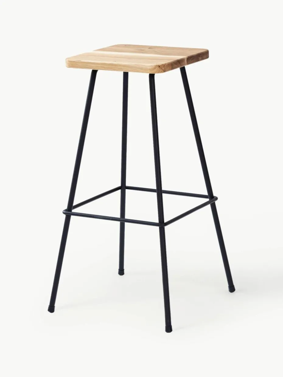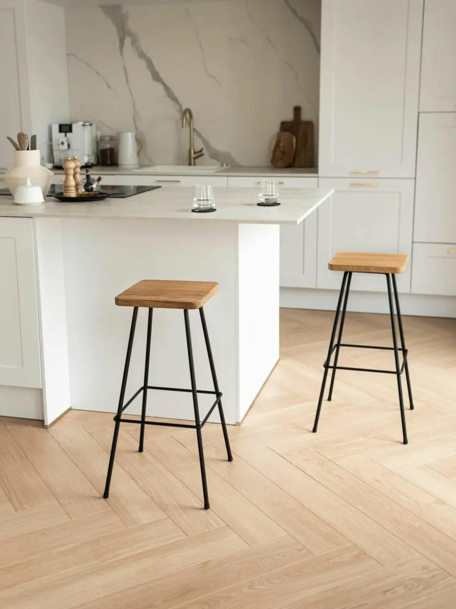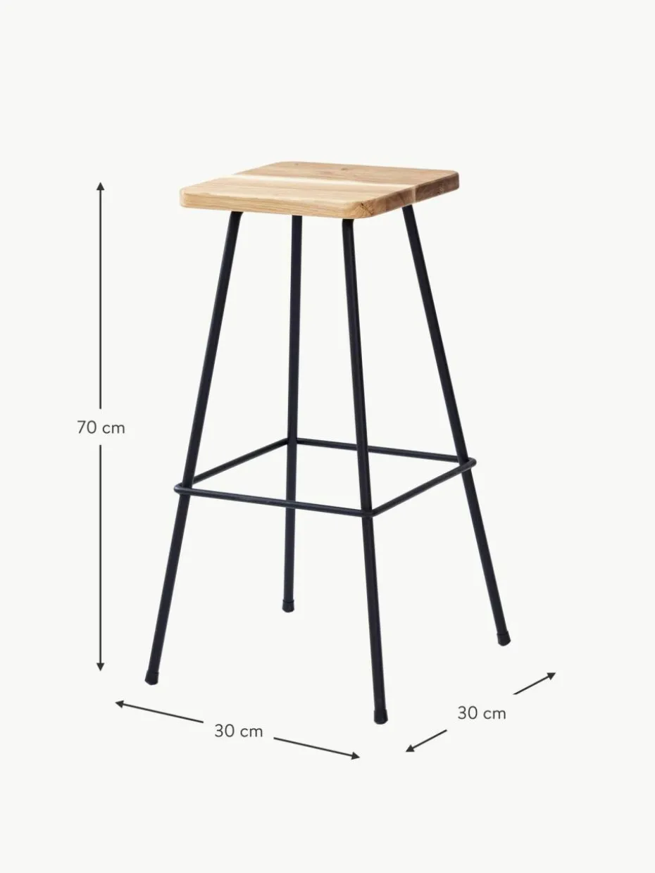 Barhocker Barni strahlt eine unvergleichliche Atmosphäre aus. Ob am gemütlichen Tresen deiner Küche oder an einer Bar im Industrial Look: das hohe, schlanke Design des hochwertigen Vierfußgestells aus Metall überzeugt durch seinen minimalistischen Charme. Dazu bildet das Eichenholz mit seiner ausdrucksstarken Maserung einen aufregenden Kontrast.