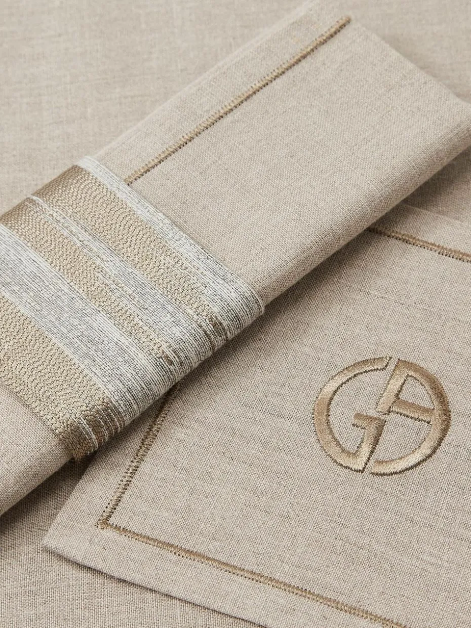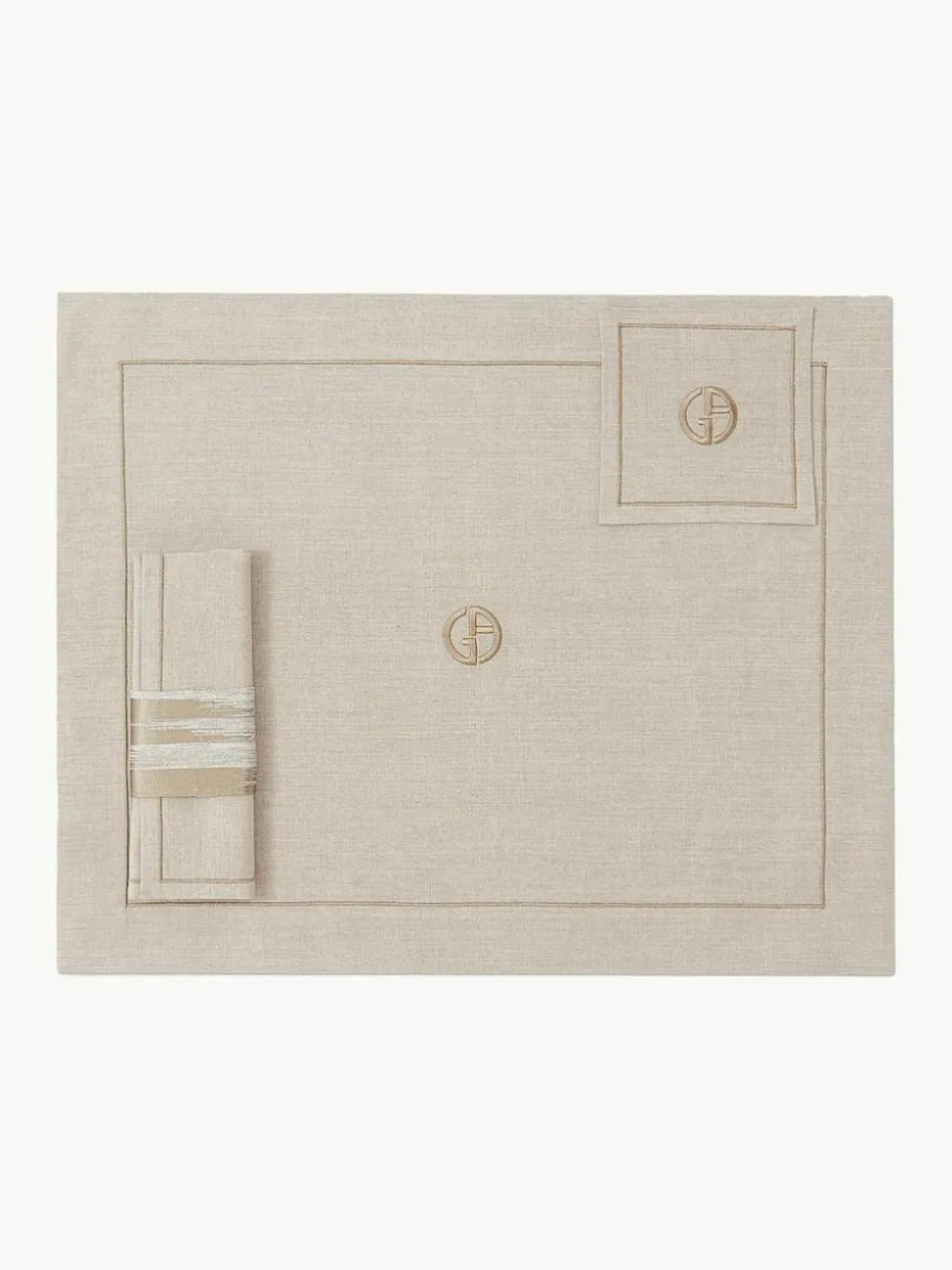 Ein Textilien-Set bestehend aus einem Tischset, einem Untersetzer, einer Serviette und einem Serviettenring. Das Set ist in verschiedenen Farbkombinationen erhältlich.