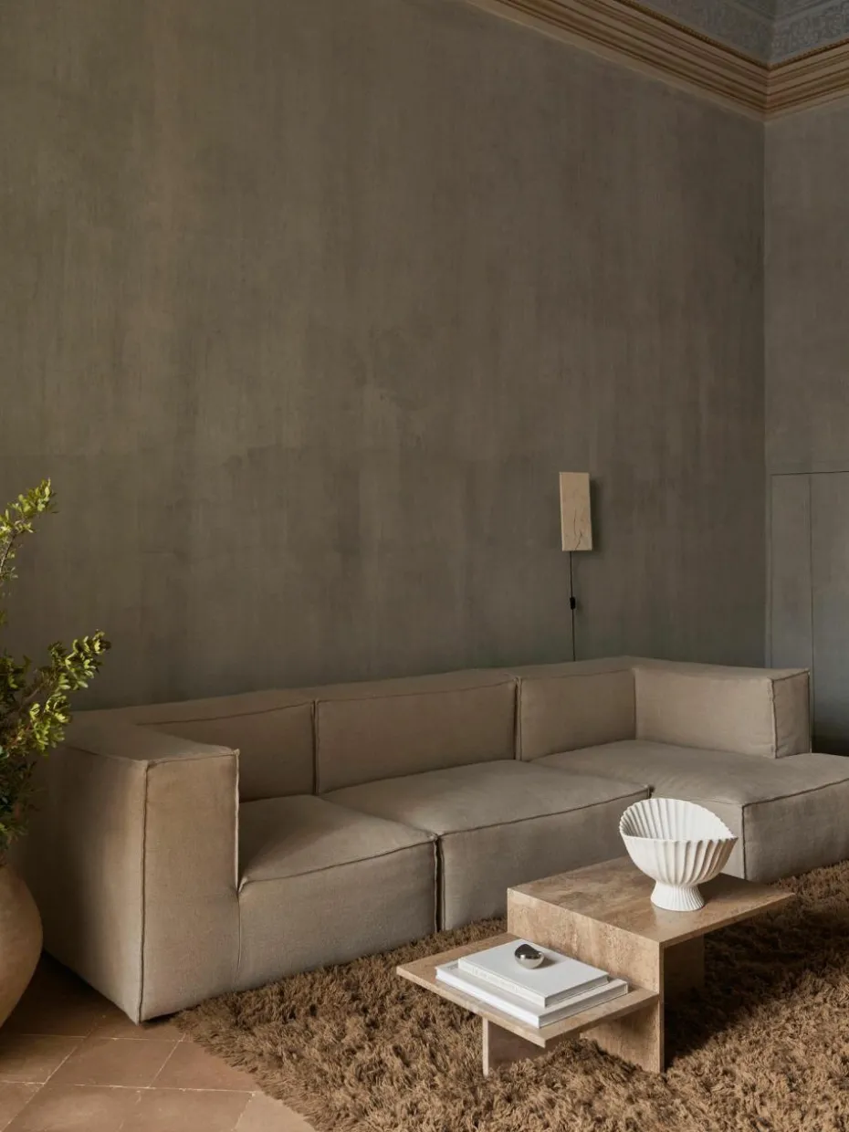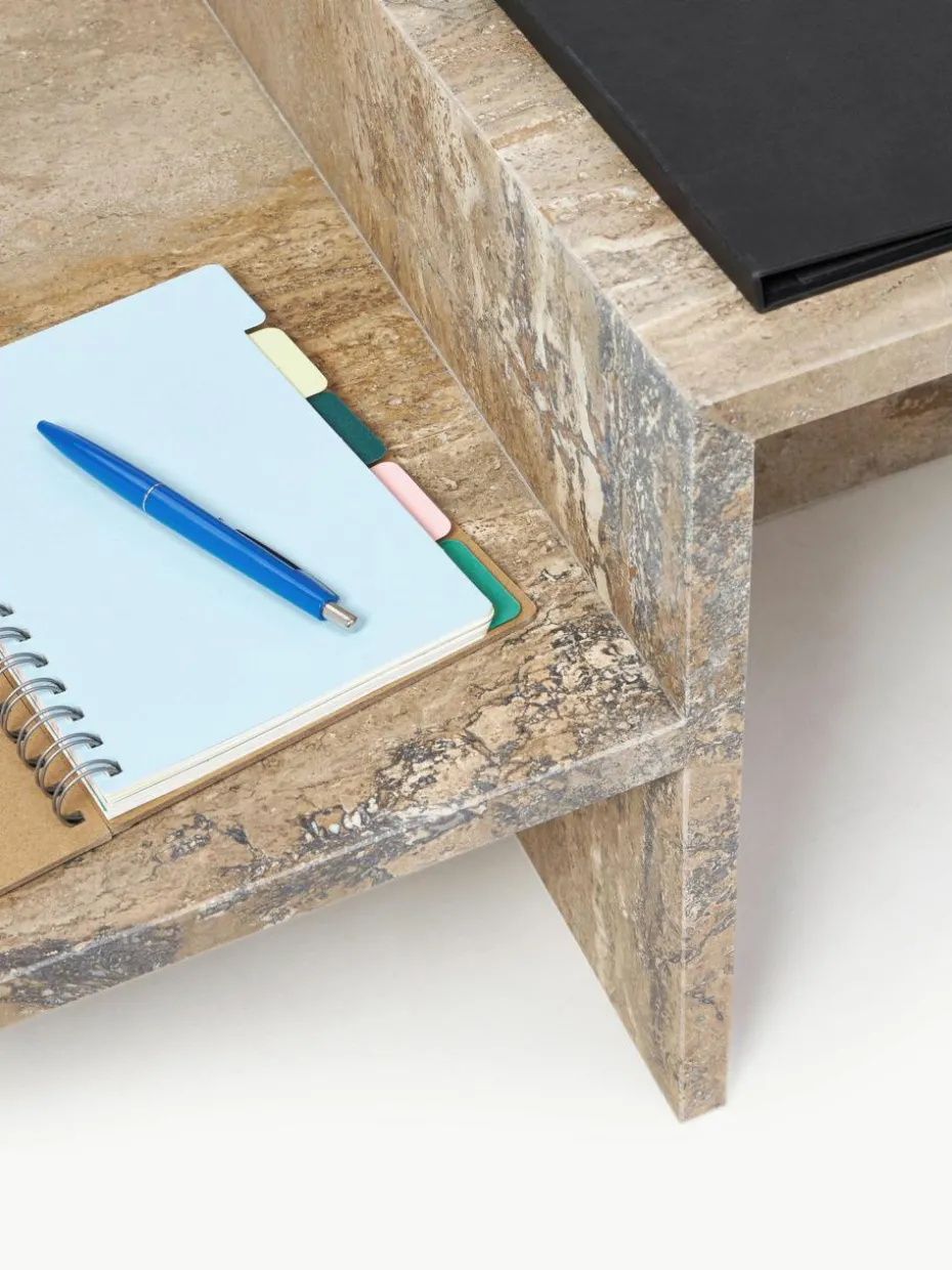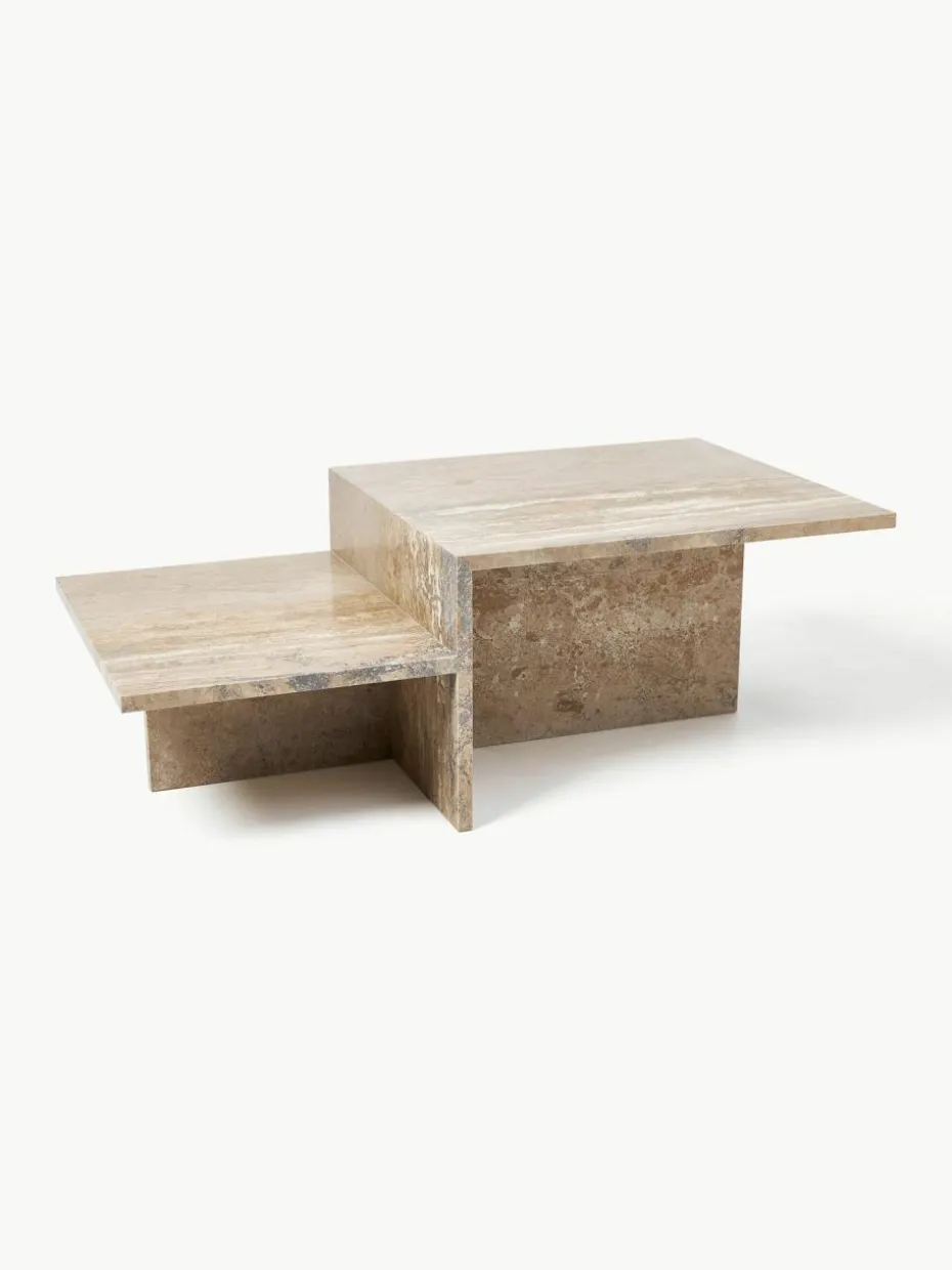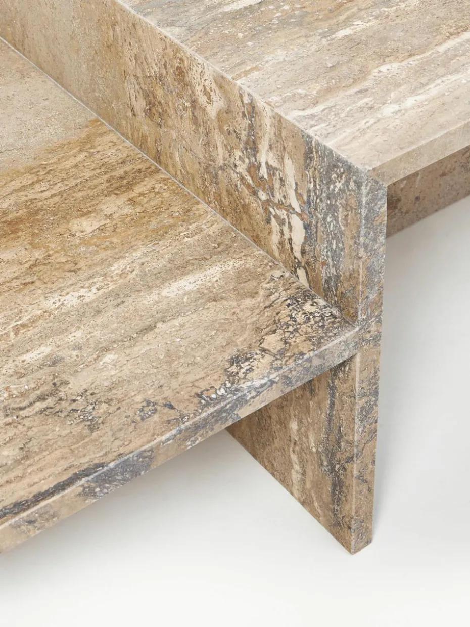 Ursprünglich vom japanischen Minimalismus inspiriert, erforscht der Distinct Couchtisch die Schaffung komplexer Strukturen, die auf einem einzigen Element basieren. Die minimalistische Konstruktion bildet einen Kontrast zur Fülle der erdigen Travertin-Texturen. Die natürlichen und vielfältigen Eigenschaften des Kalksteins bieten Rohheit und Greifbarkeit, die den architektonischen Charakter des Möbelstücks unterstreichen.