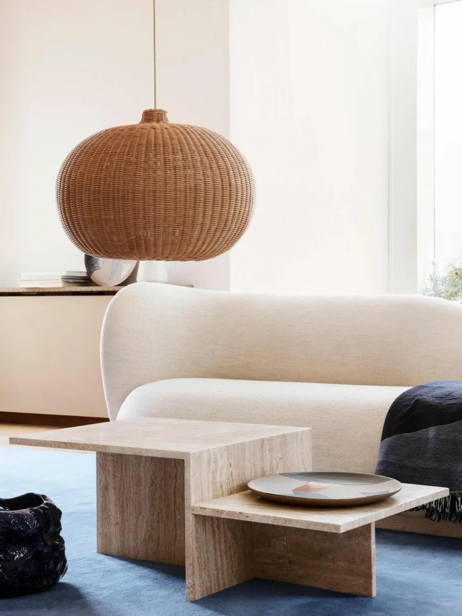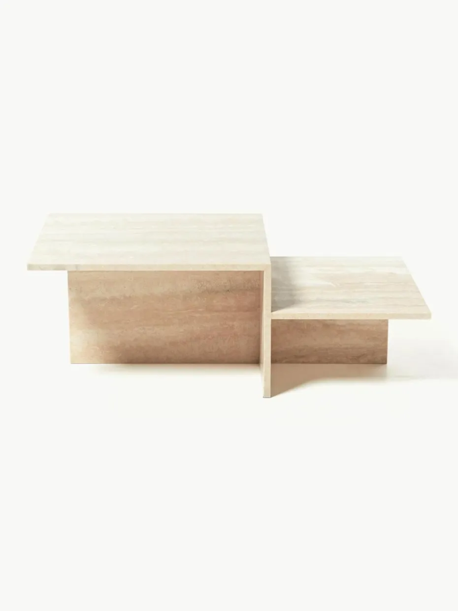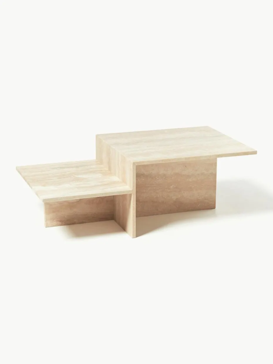 Ursprünglich vom japanischen Minimalismus inspiriert, erforscht der Distinct Couchtisch die Schaffung komplexer Strukturen, die auf einem einzigen Element basieren. Die minimalistische Konstruktion bildet einen Kontrast zur Fülle der erdigen Travertin-Texturen. Die natürlichen und vielfältigen Eigenschaften des Kalksteins bieten Rohheit und Greifbarkeit, die den architektonischen Charakter des Möbelstücks unterstreichen.