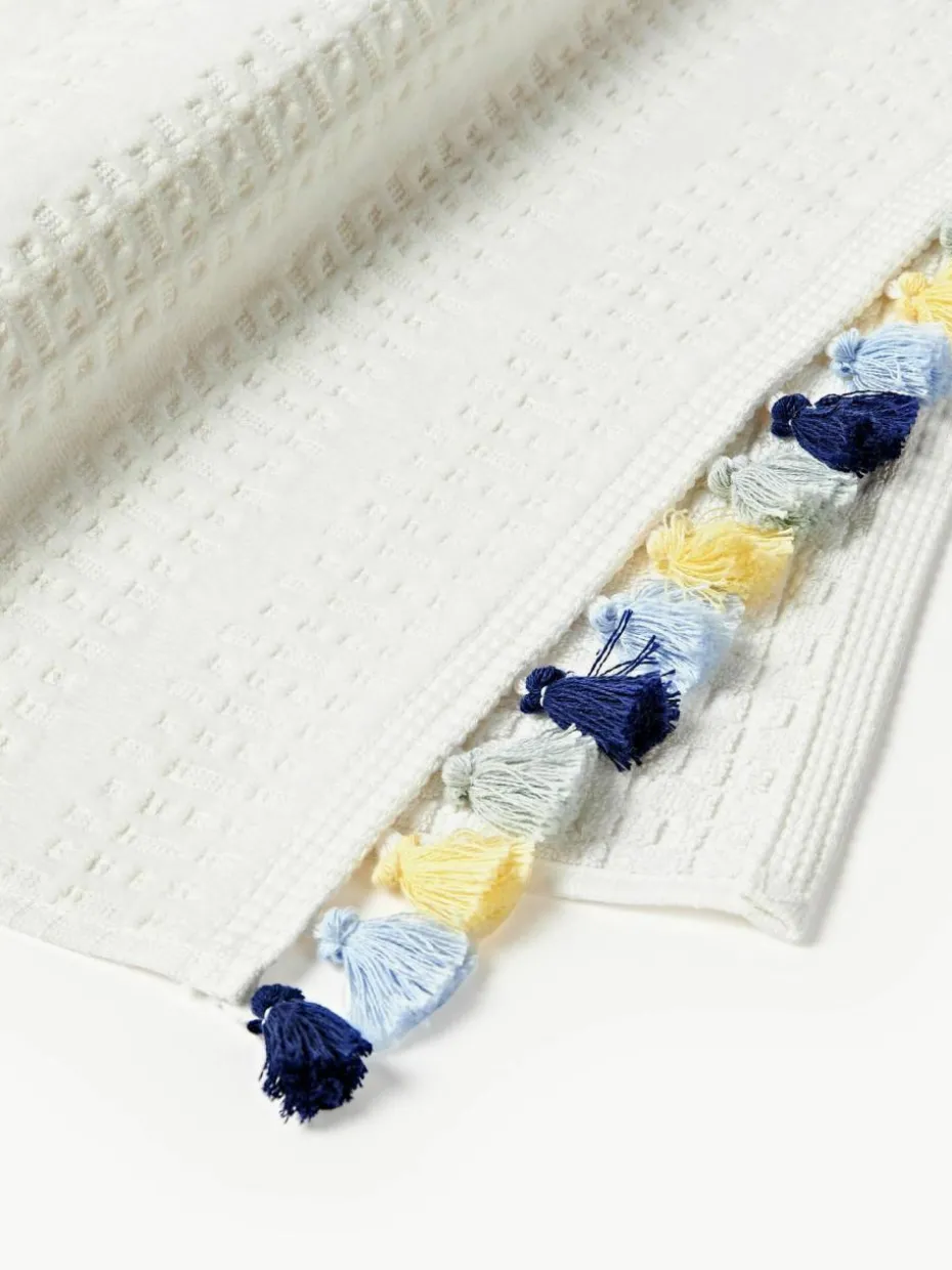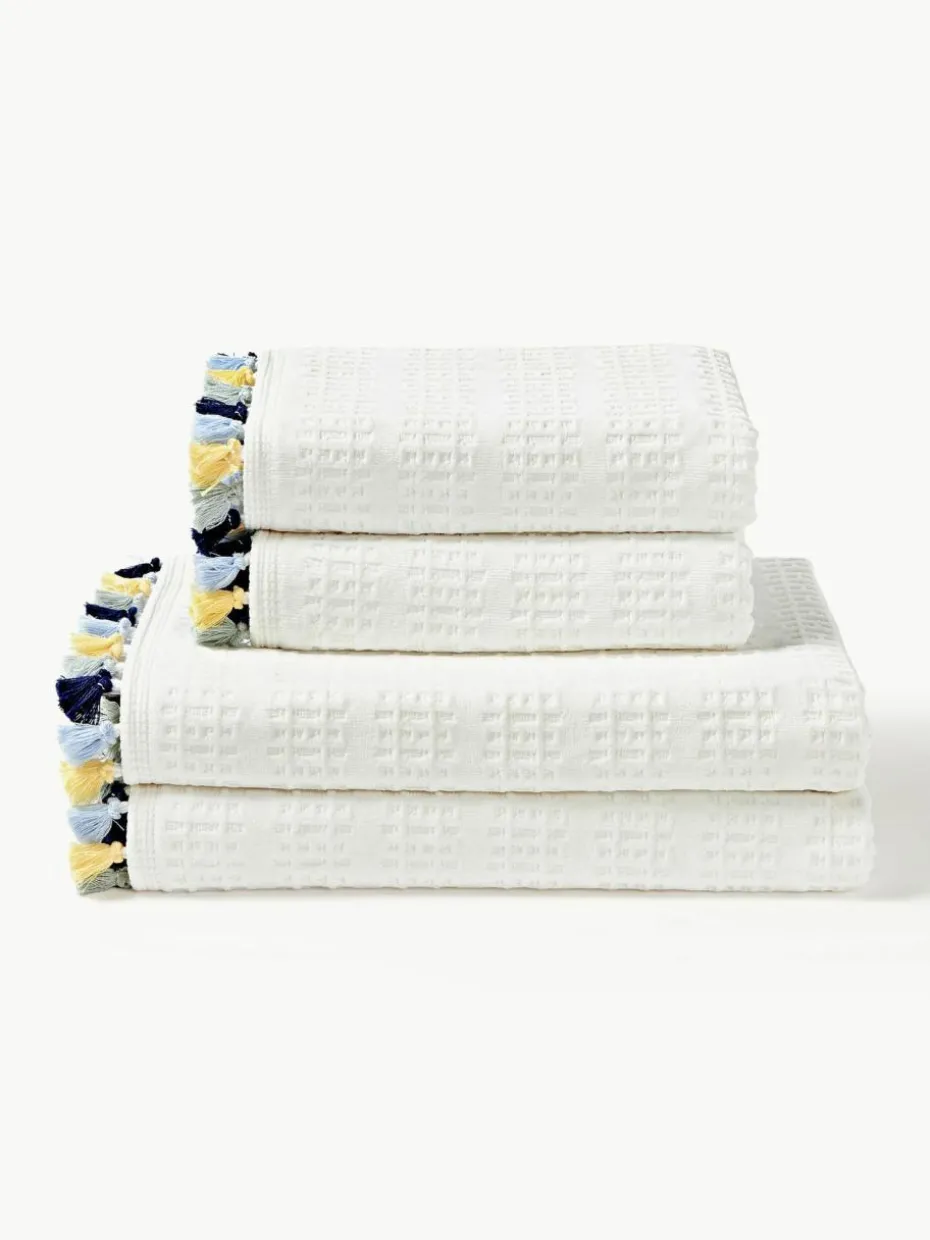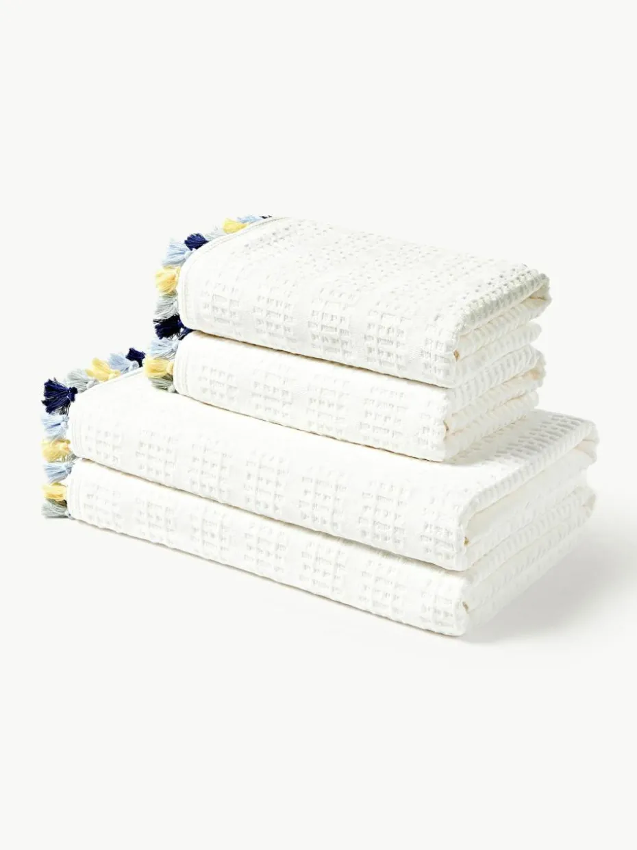 Dieses Handtuch-Set mit Velour auf der Vorderseite und Baumwolle mit Hoch-Tief-Struktur auf der Rückseite besteht aus einem Gästehandtuch, einem Handtuch und einem Duschtuch. Das Handtuch-Set verfügt über Aufhängeschlaufen und wurde in Portugal gefertigt.