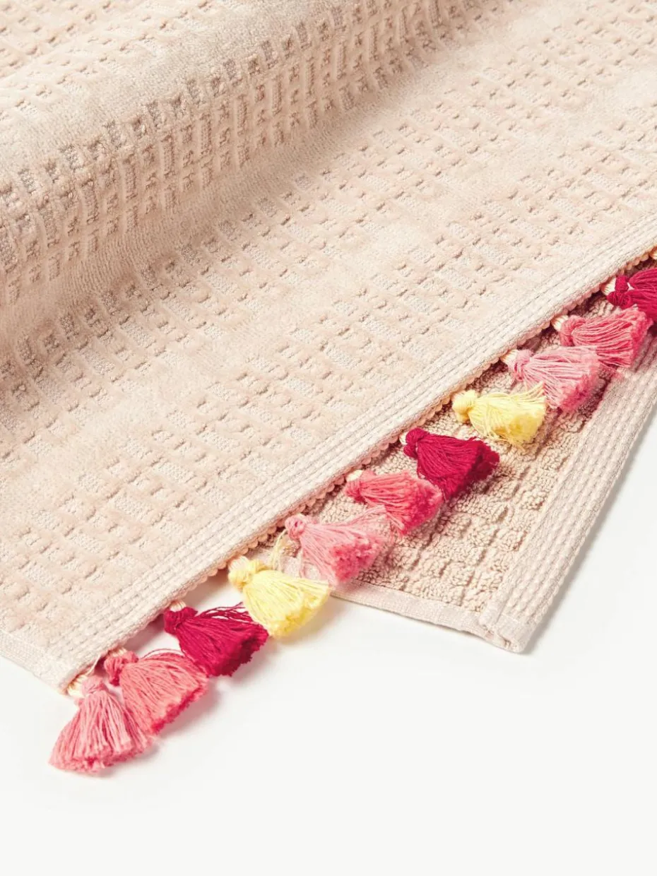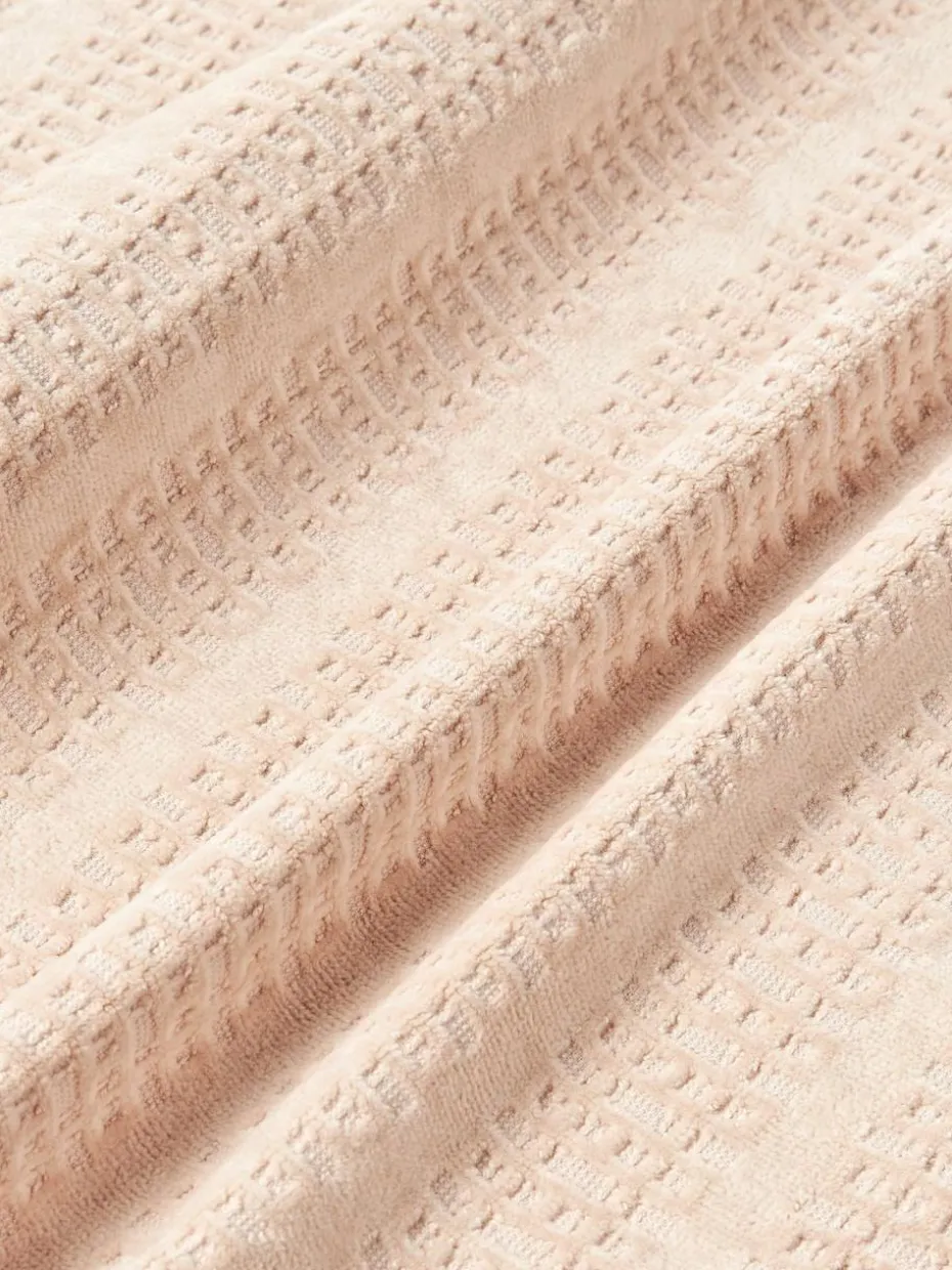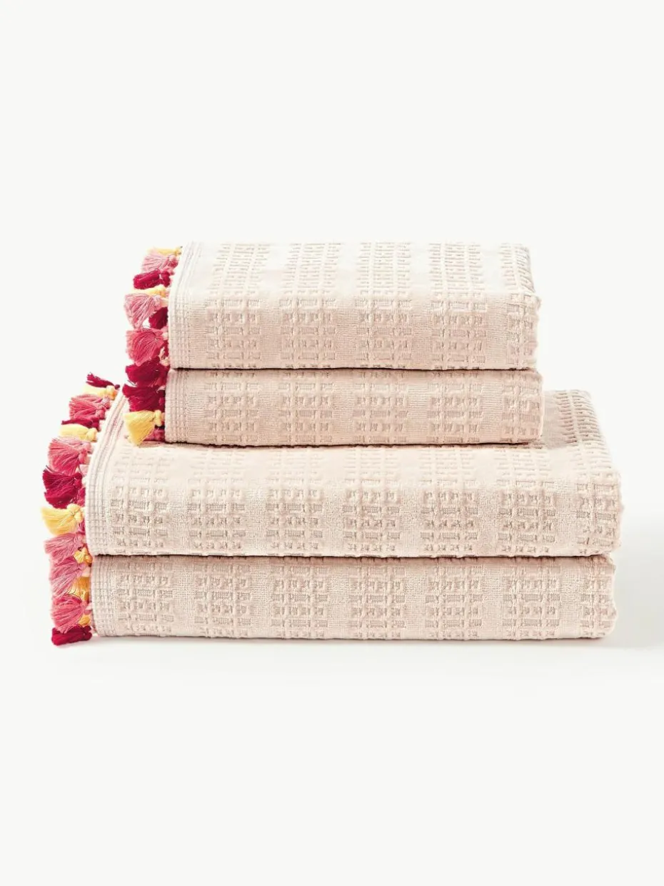 Dieses Handtuch-Set mit Velour auf der Vorderseite und Baumwolle mit Hoch-Tief-Struktur auf der Rückseite besteht aus einem Gästehandtuch, einem Handtuch und einem Duschtuch. Das Handtuch-Set verfügt über Aufhängeschlaufen und wurde in Portugal gefertigt.