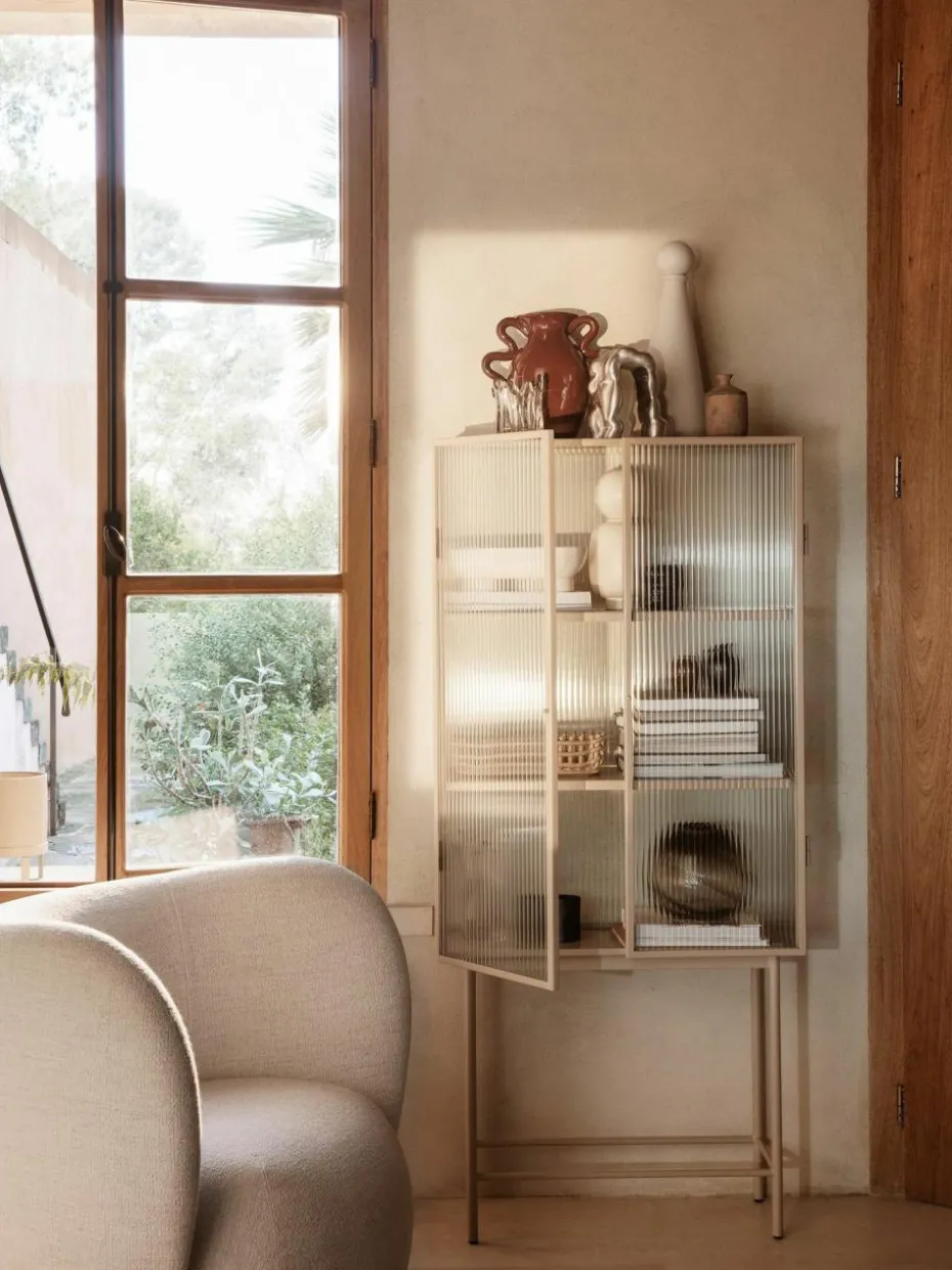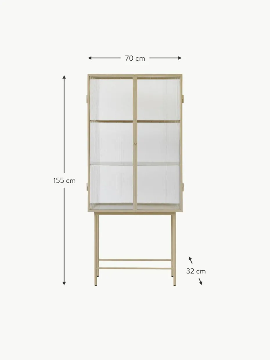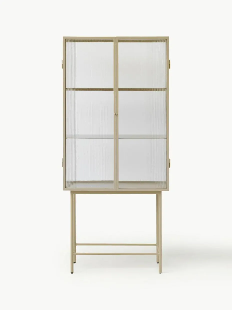Gegensätze ziehen sich an – das gilt auch für diese Vitrine, die aus glattem, pulverbeschichtetem Metall in einem weichen Beigeton und Wellglas gefertigt ist. Die geriffelten Glaswände und Türen unterstreichen den aufwendigen Stil und verschleiern den Blick neugieriger Augen auf den Inhalt. Die Glastüren lassen sich dank Magneten nahtlos und leise schließen und zeigen beim Öffnen zwei Regalböden. Haze kann als moderner Blickfang ebenso im Badezimmer wie auch im Ess- oder Wohnzimmer verwendet werden.