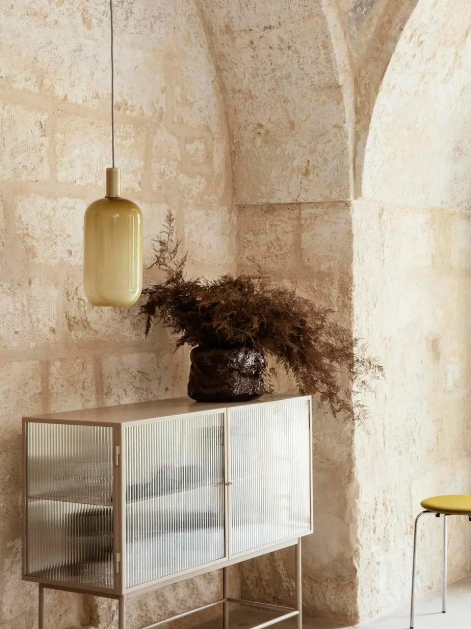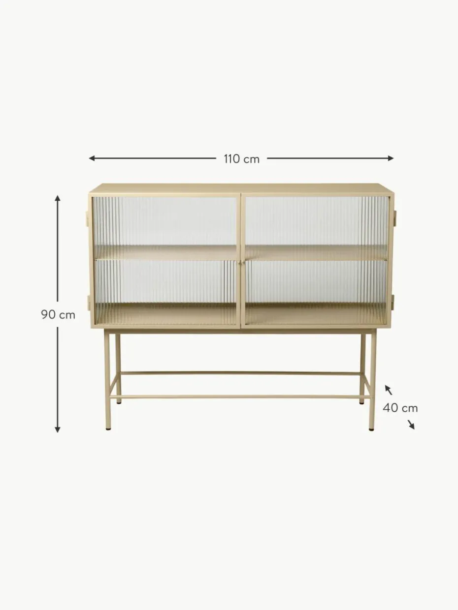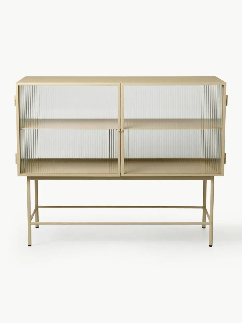 Gegensätze ziehen sich an – das gilt auch für diese Vitrine, die aus glattem, pulverbeschichtetem Metall in einem weichen Beigeton und Wellglas gefertigt ist. Die geriffelten Glaswände und Türen unterstreichen den aufwendigen Stil und verschleiern den Blick neugieriger Augen auf den Inhalt. Die Glastüren lassen sich dank Magneten nahtlos und leise schließen und zeigen beim Öffnen einen Regalboden. Haze kann als moderner Blickfang ebenso im Badezimmer wie auch im Ess- oder Wohnzimmer verwendet werden.